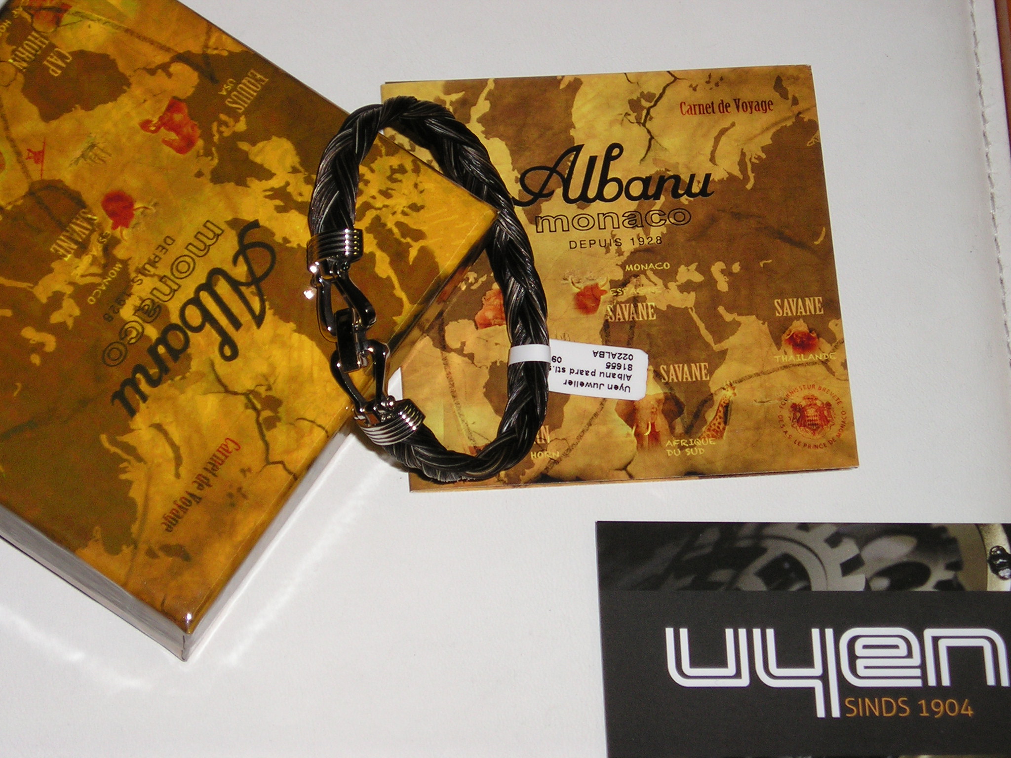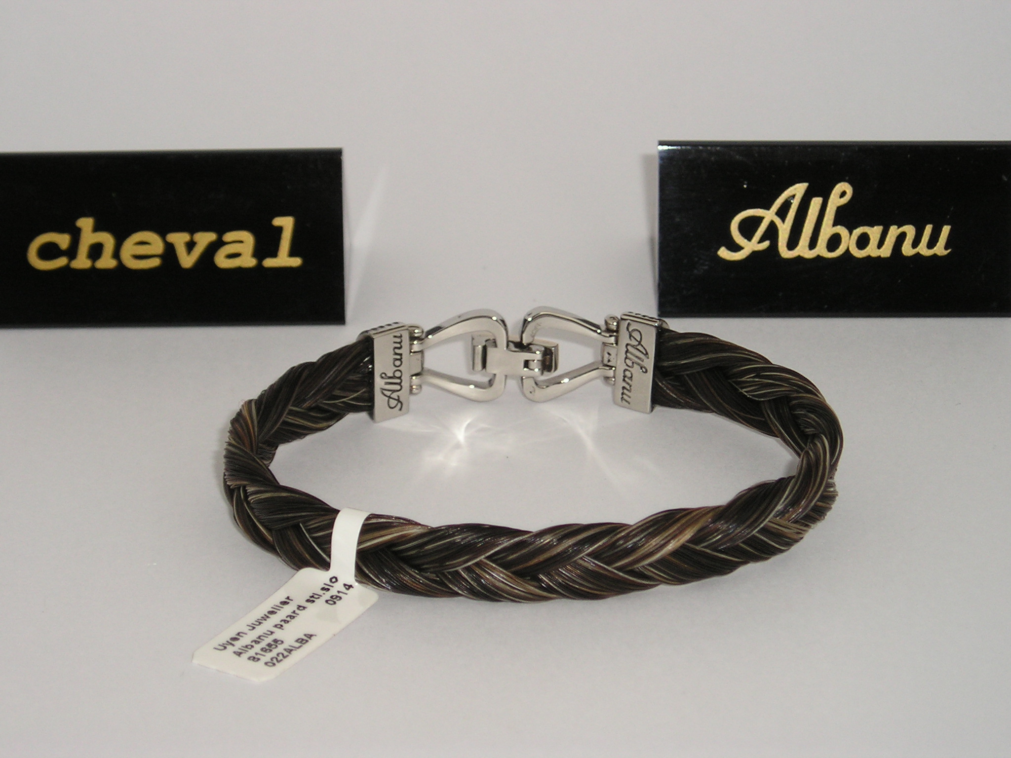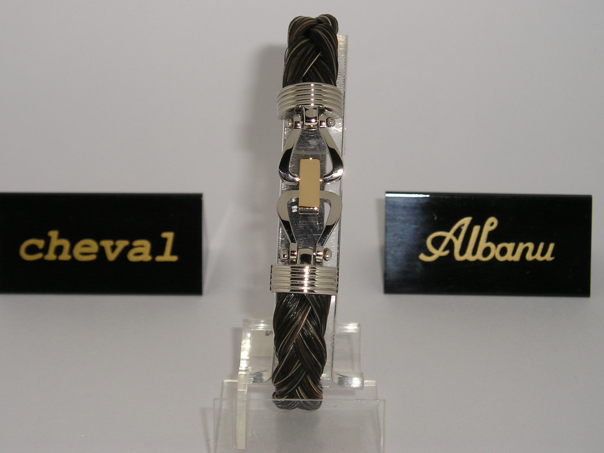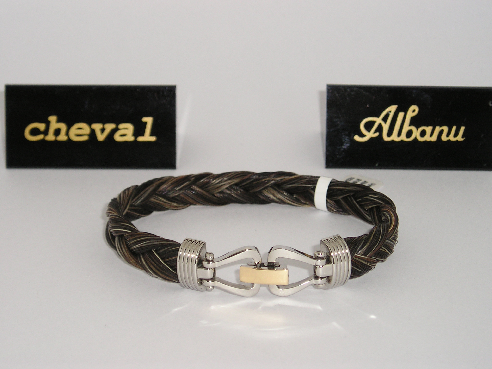 Albanu Monaco, paardenhaar armband met staal/18 karaats gouden sluiting in vorm van stijgbeugels. Nieuw, ongedragen! Incl. origineel verpakking en certificaat. €. 525,0