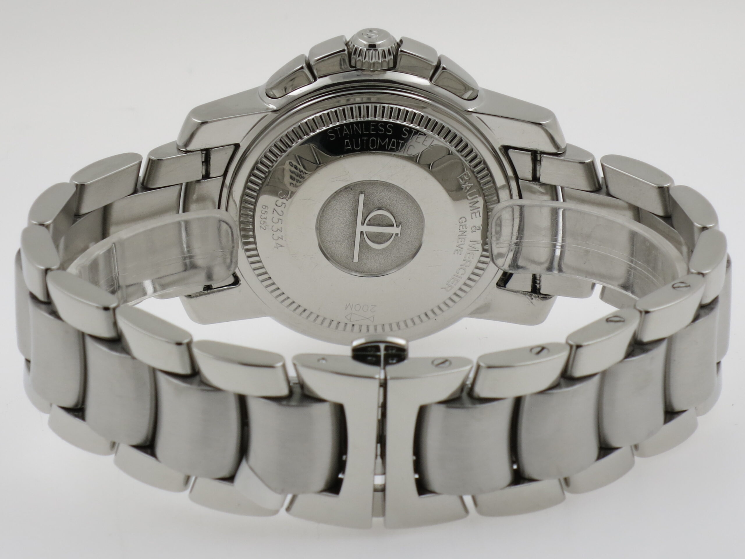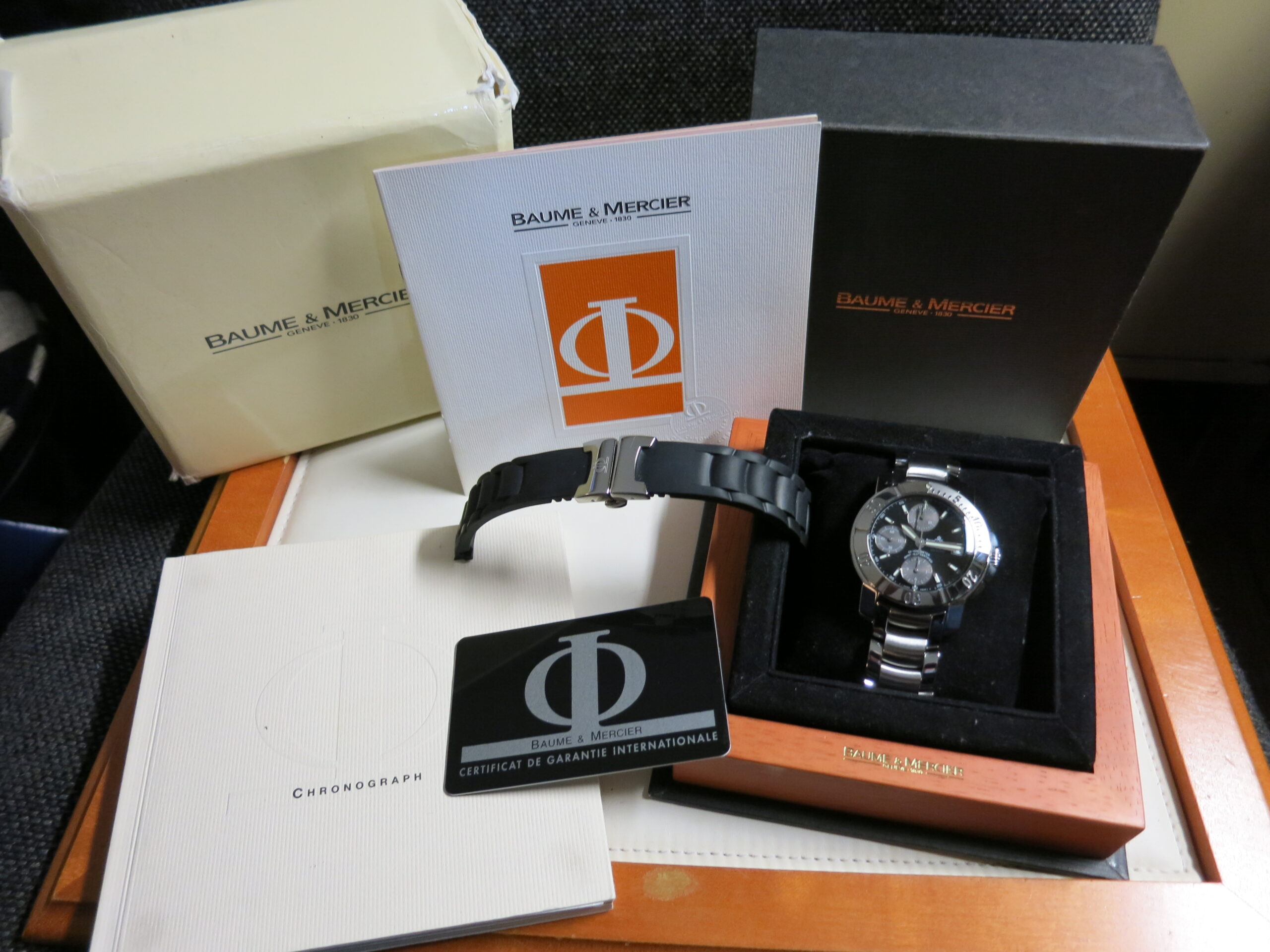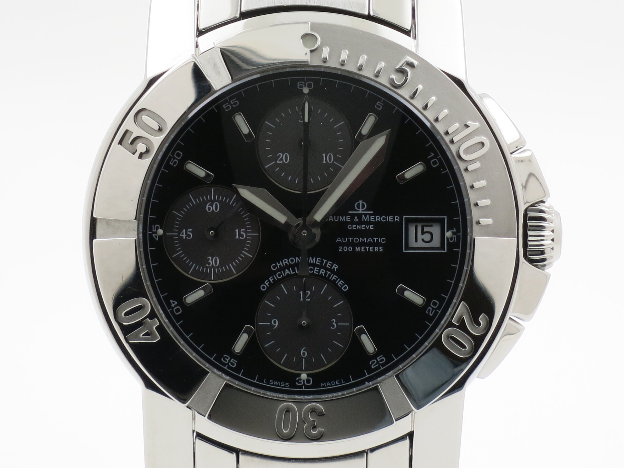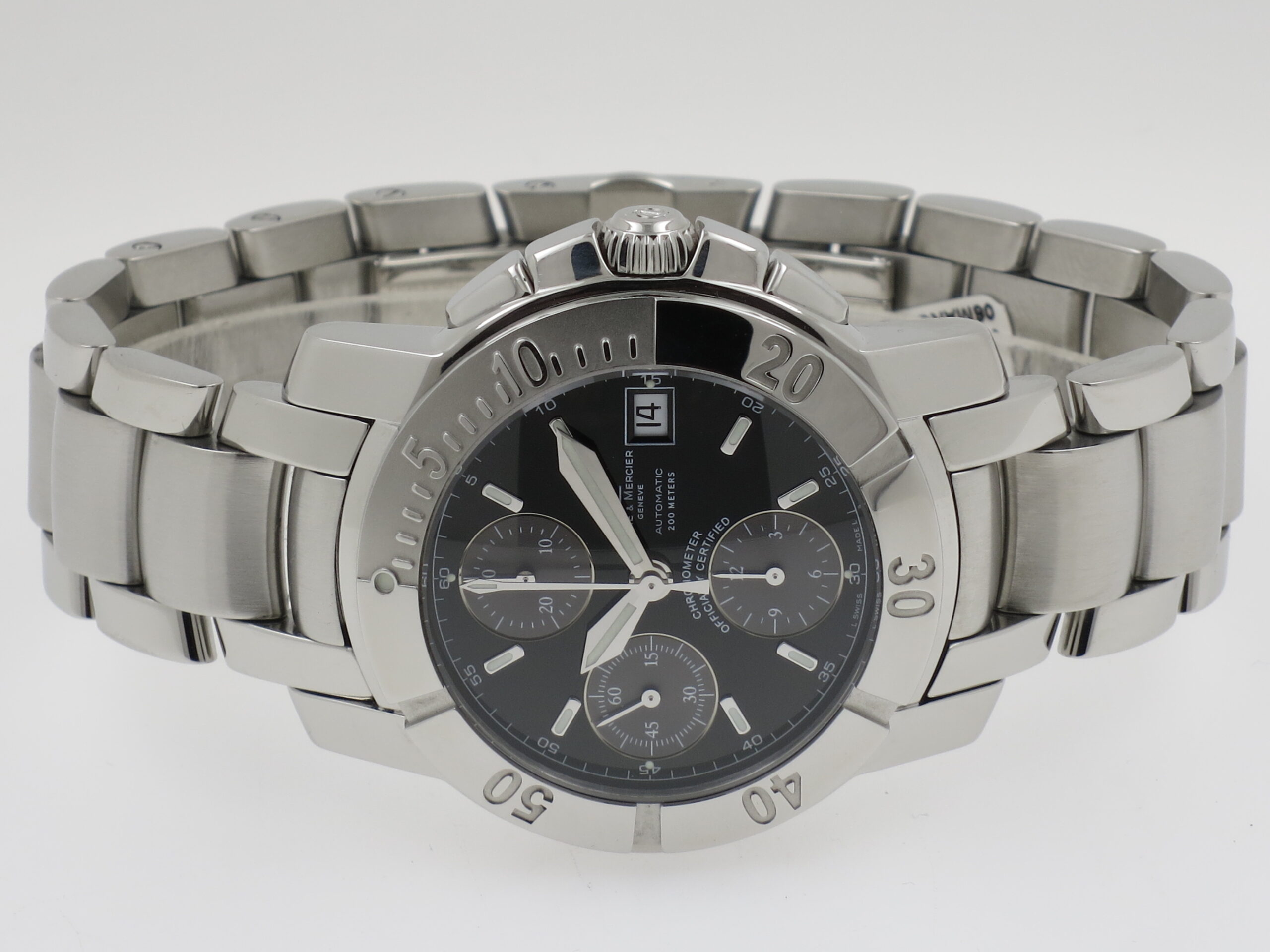 BAUME & MERCIER "Capeland XL Chronographe Automatic" ref. MOA08112 Steel 40mm. case with sapphire glass. Black colored dial. Automatic movement, caliber BM 13750 c.o.s.c. with time, date and chronograph. Steel bracelet and extra black rubber strap with folding claps. Complete with original box and all certificates year 2006. €. 1.595,00