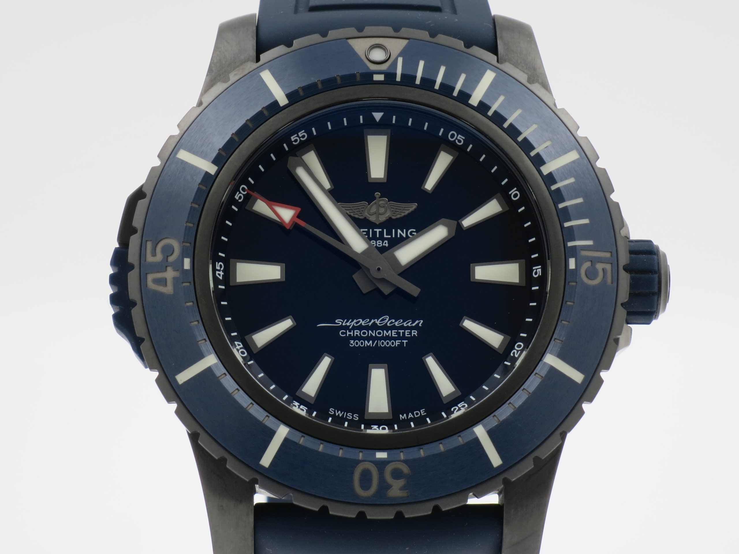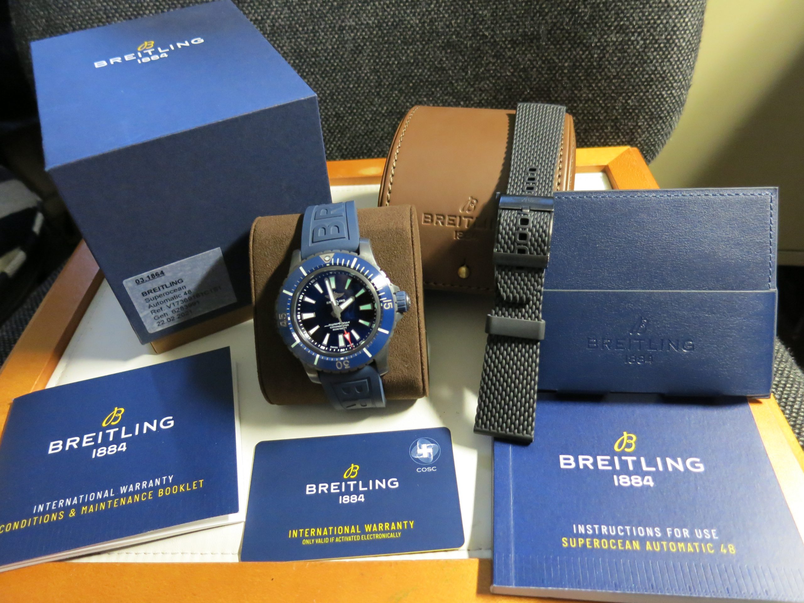 BREITLING "SuperOcean 48 Automatic" ref. V17369 Titanium black DLC case with bleu ceramic diver bezel. Sapphire glass. Blue colored dial with luminor hands/index. Automatic movement, caliber Breitling 17 c.o.s.c. with time. Bleu "Diver Pro" and black "Aero Classic" rubber straps. Complete with original box and all certificates year 2021. €. 3.900,00