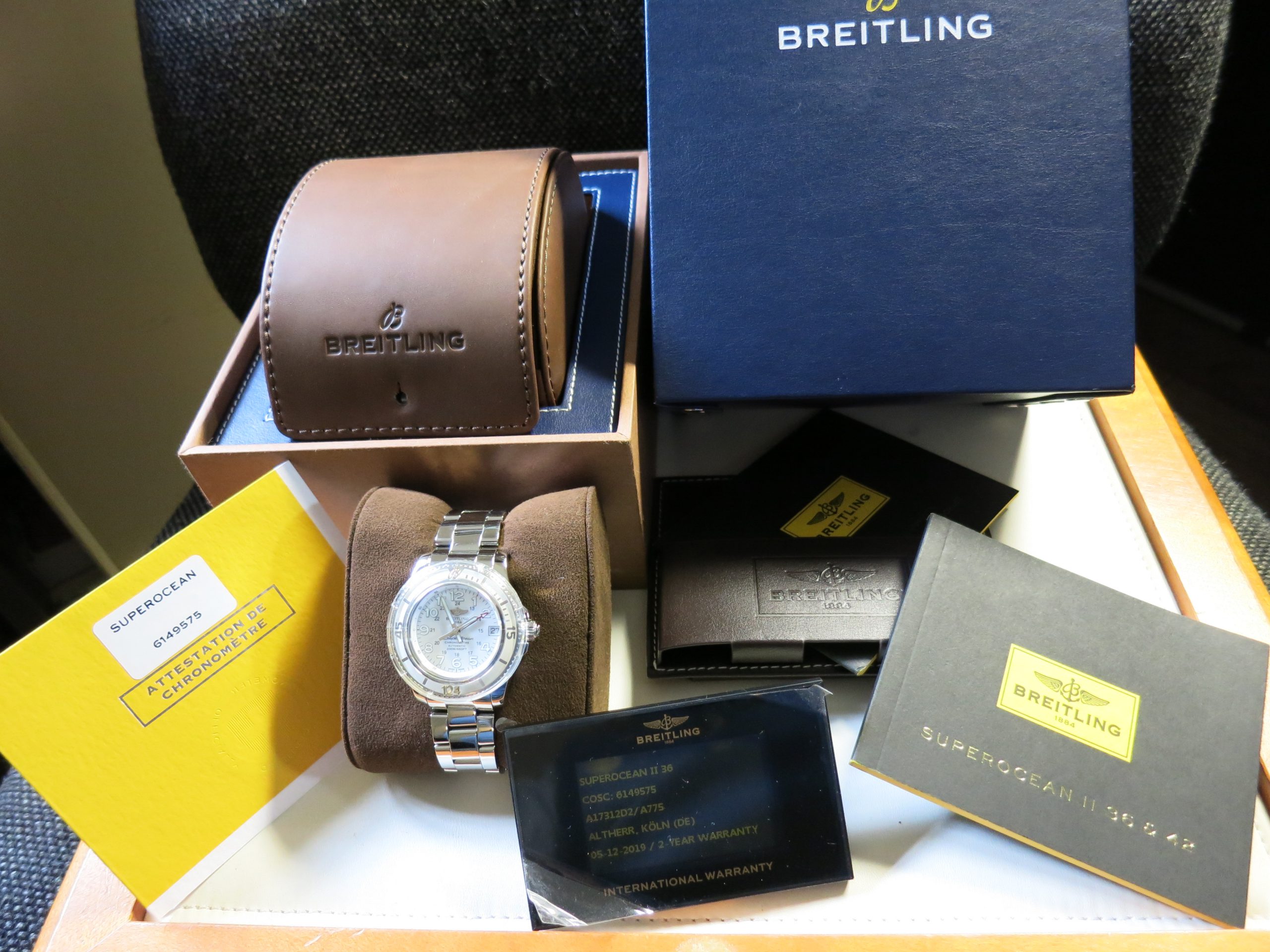 BREITLING "SuperOcean II 36 Automatic" ref. A17312 Steel 36mm. case with sapphire glass. White steel/rubber diver bezel. white colored dial with numbers. Automatic movement, caliber Breitling 17 c.o.s.c. with time and date. Steel "Professional III" bracelet. Waterresistant 200 meter. Complete with original box and all certificates year 2019. €. 2.850,00