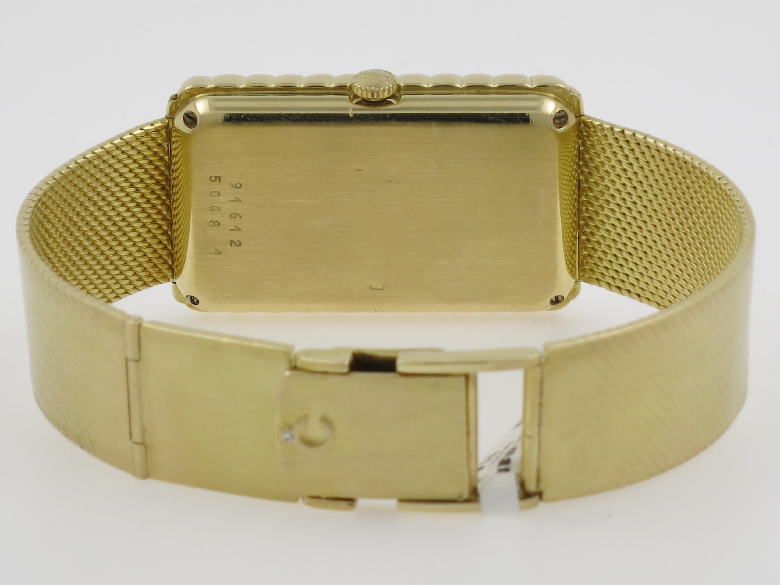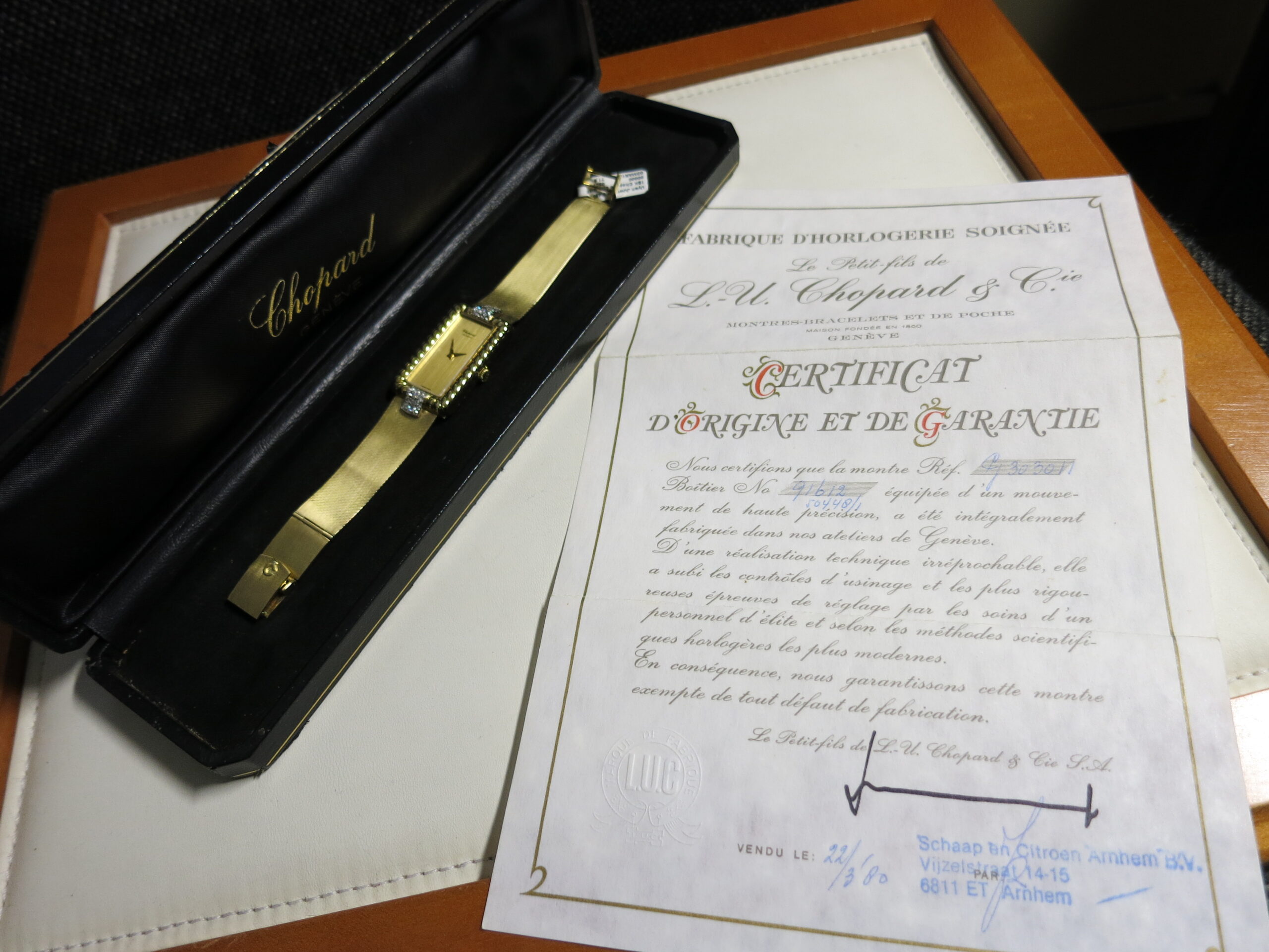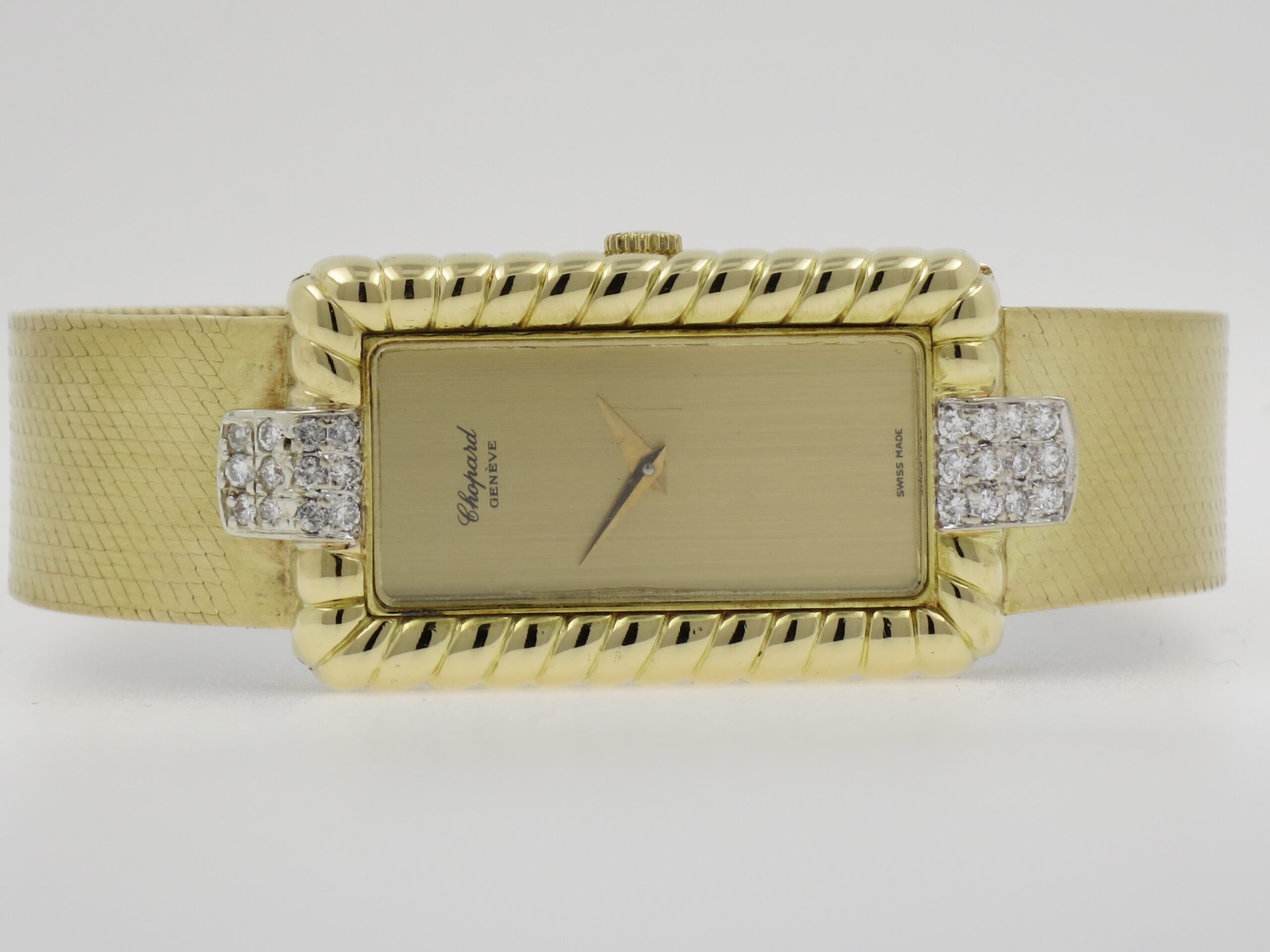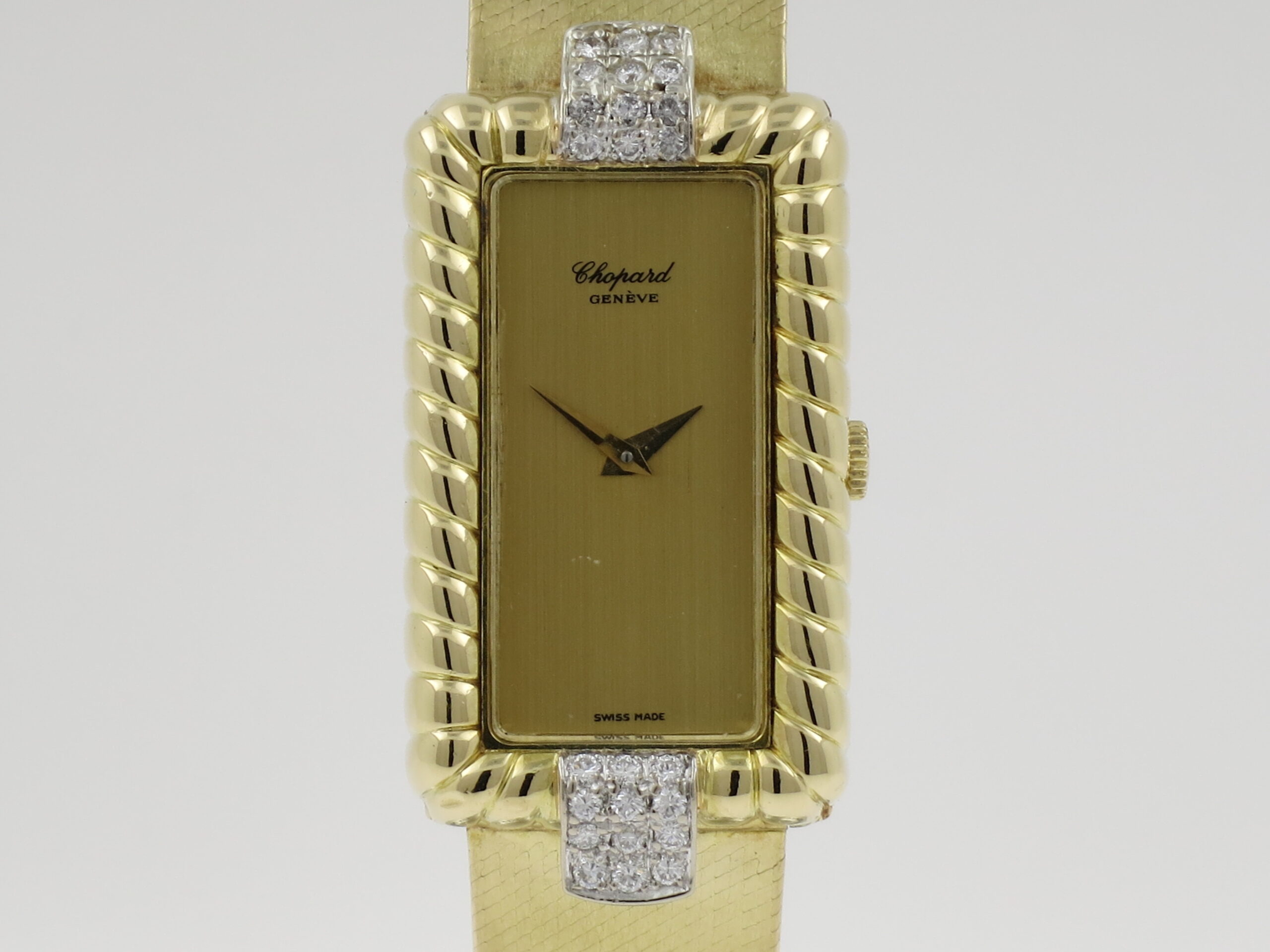 CHOPARD "Dress Watch Diamonds" ref. 5048 1 18K (750) gold case 22x36mm. with 0,48 crt. diamonds. Mineral glass. Champagne colored dial. Manual winding movement caliber LUC 2412. 18K (750) golden Milaneze bracelet (total length 17,5cm.). Incl. original box and certificate year 1980. Full Service made Mrt. 2023! €. 7.750,00