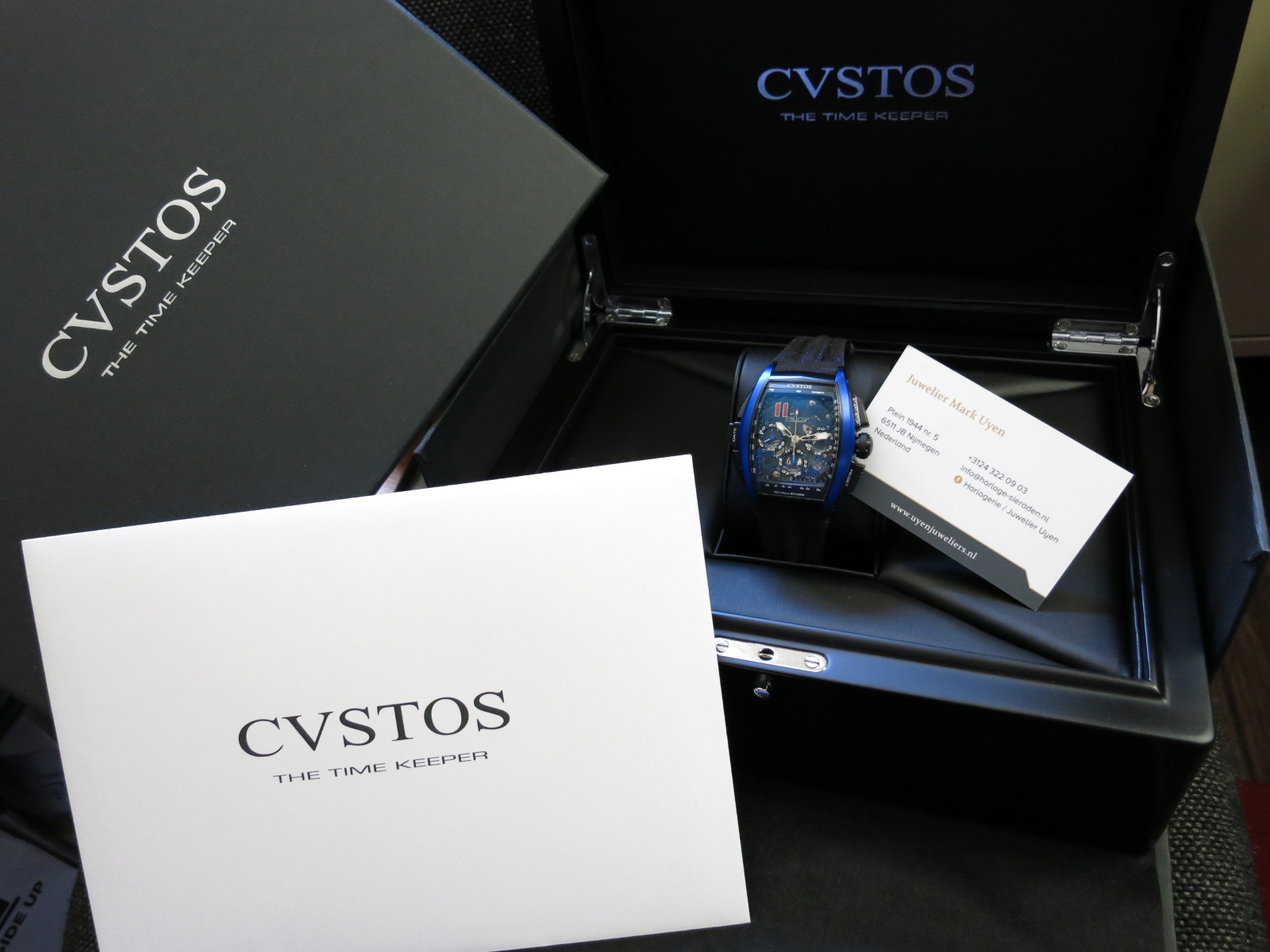 CVSTOS "Challenge PILOT Chronograph" ref. CV11043CHPILTN0000AB0001 Limited Edition 057/200 Titan with blue ergal tonneau case 43,7x41mm. Anti-reflex coated sapphire glass. 3D black dial. Automatic movement, caliber CVS357 with time, date and chronograph. Bleu rubber 'Sprint" strap and extra black alcantara strap with blue stiching. PVD black steel folding claps. Incl. original box and all certificate with 2 yrs. int. warranty. New, onworn!!! from €. 23.100,00 for €. 12.245,00