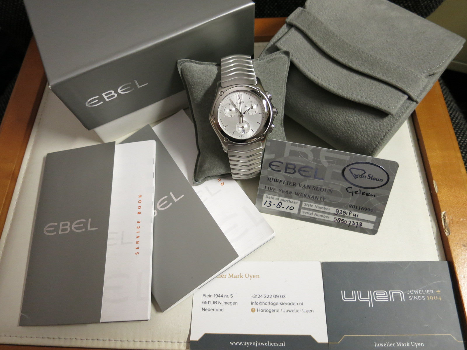 EBEL "Classic Wave Chronograph" ref. 9251F41 Steel 42mm. case with sapphire glass. Silver colored dial. Quartz movement, caliber Ebel 251 with time, date and 1/10 seconds chronograph. Steel "Wave" bracelet with double folding claps. Complete with original box and all papers year 2010. Full service has been made Sept. 2020. €. 1.250,00