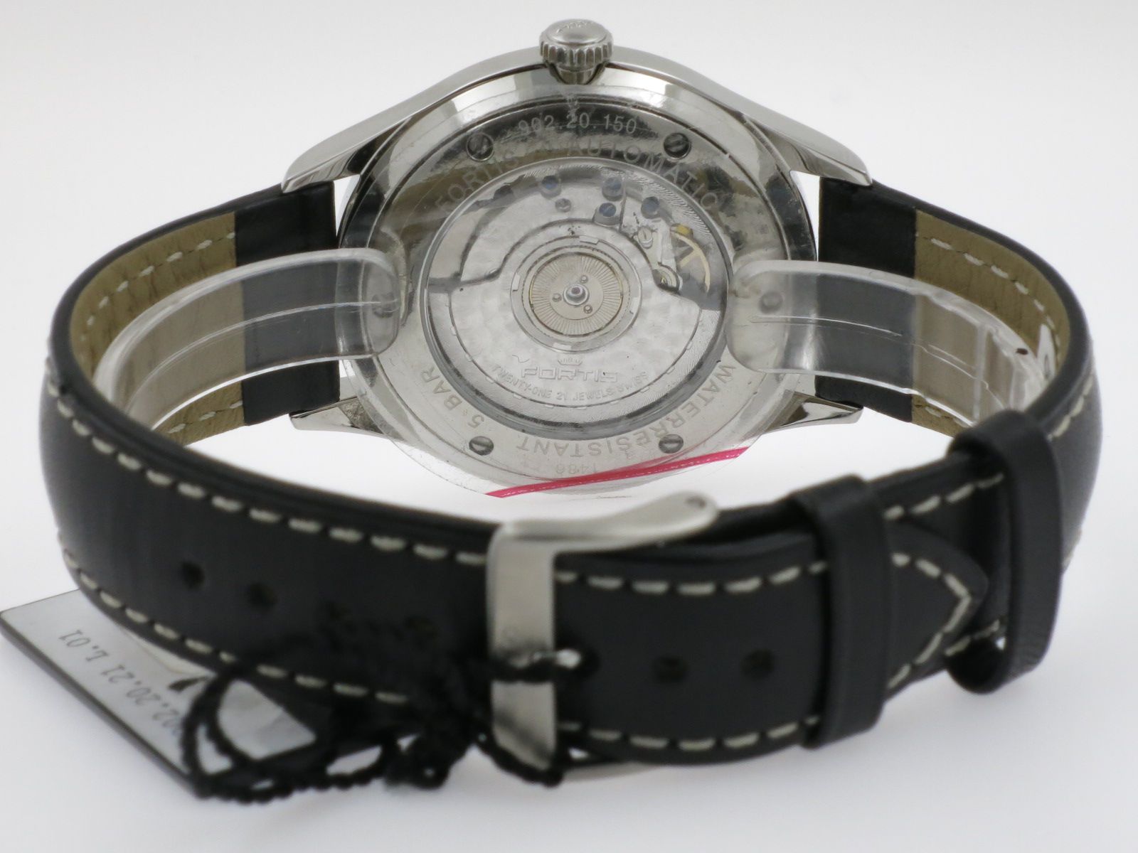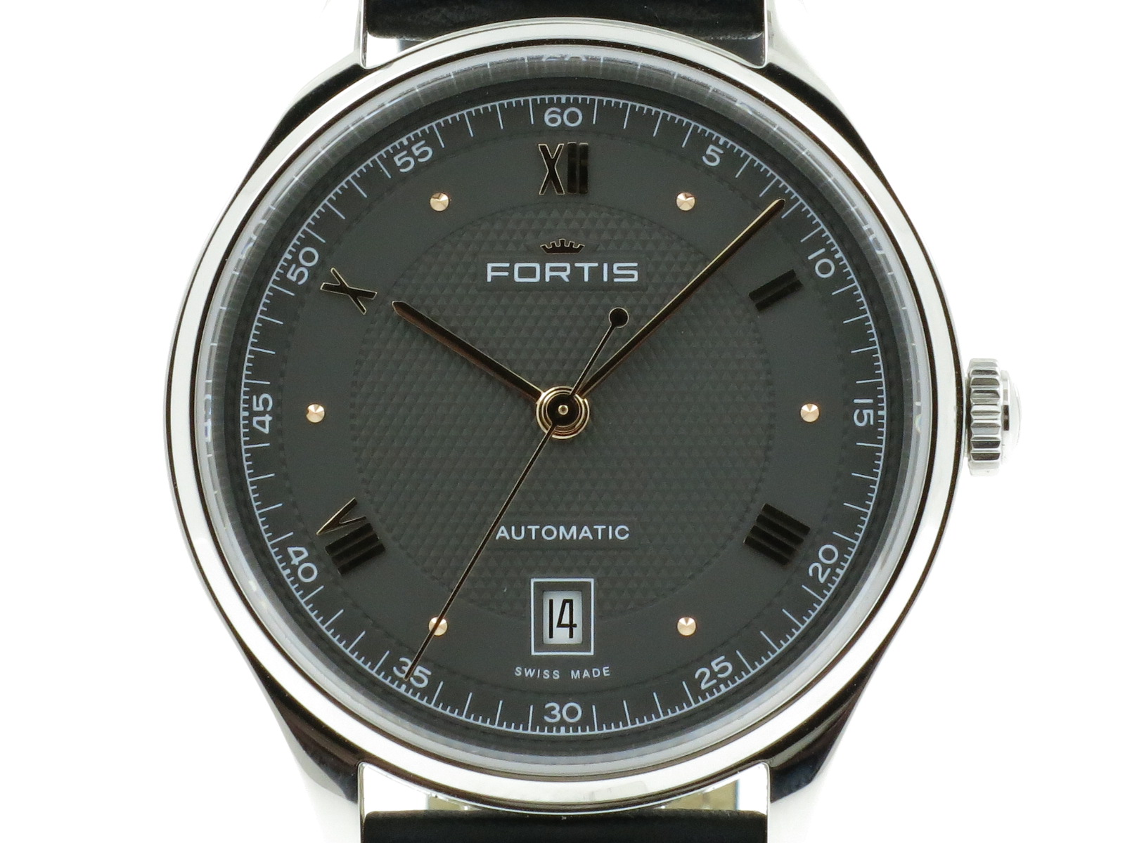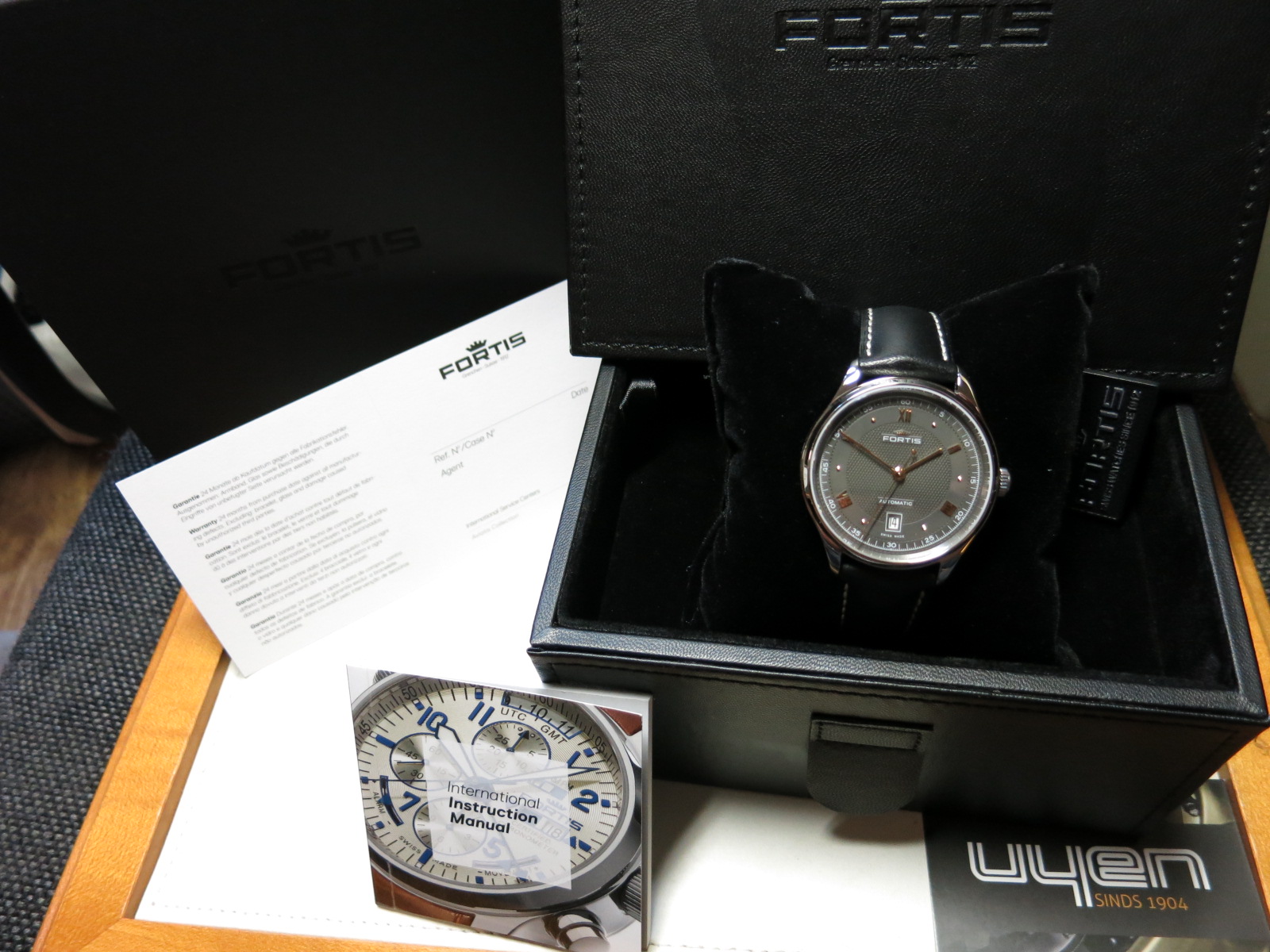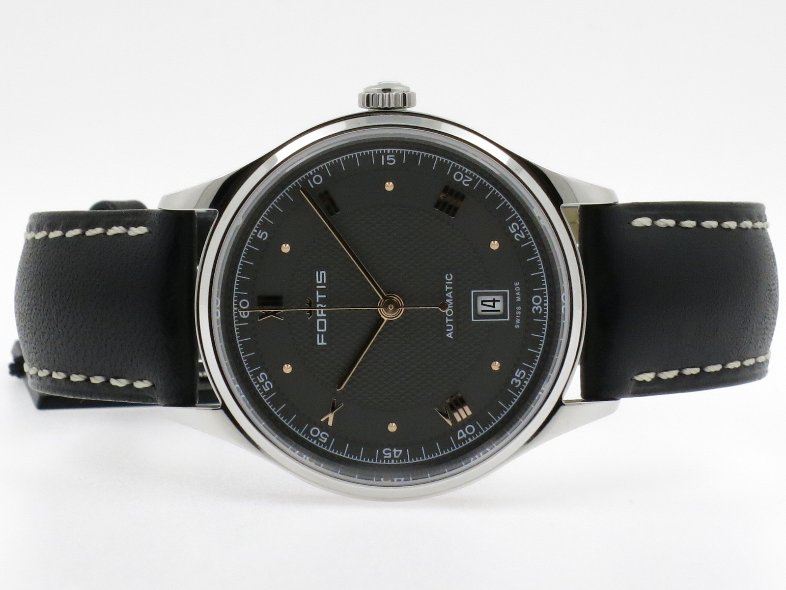 FORTIS Swiss "Terrestis Automatic" ref. 902.20.21L Steel 40mm. case with sapphire glass. Grey colored dail with rosé hands/index. Automatic movement, caliber ETA 2892-A2 with time and date. Black leather strap with buckle. Complete with original box and all papers. Two year int. warranty. New, onworn! From €. 1.780,00 for €. 1.245,00