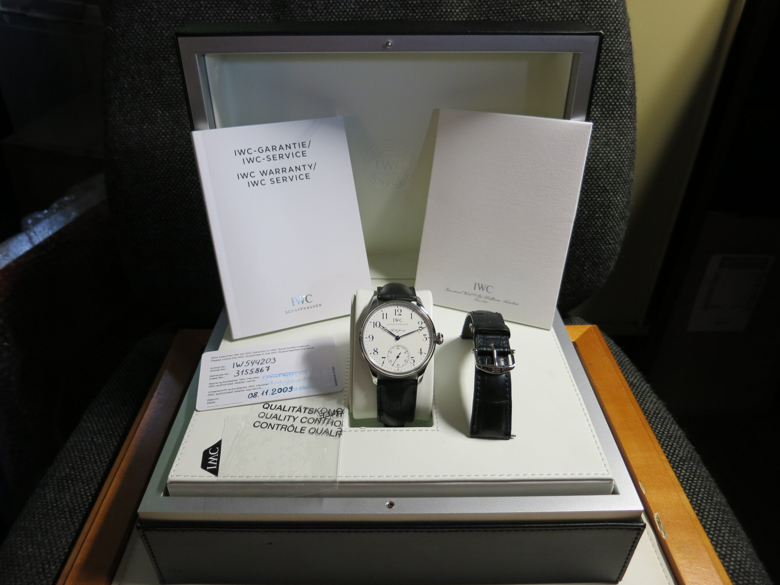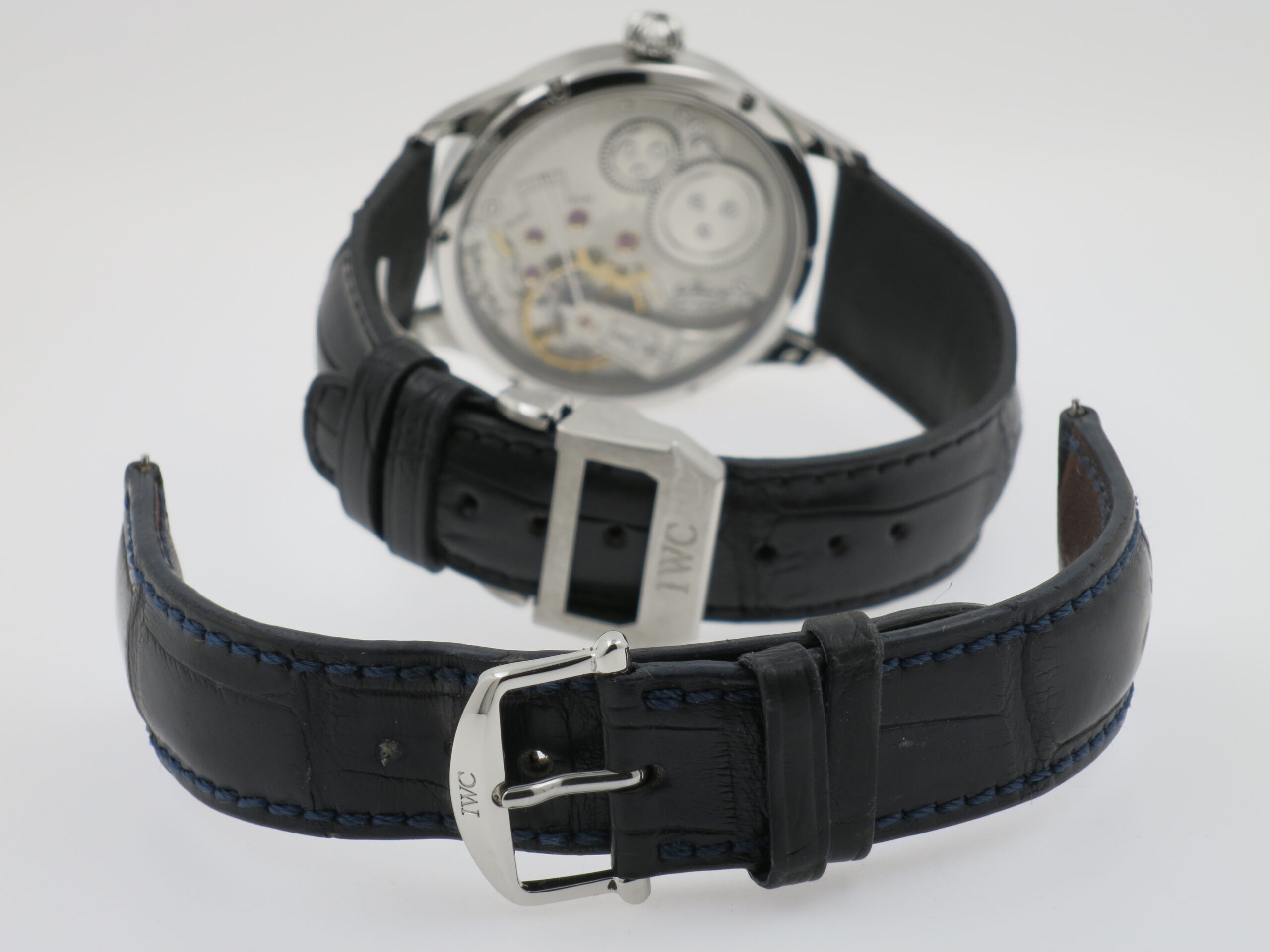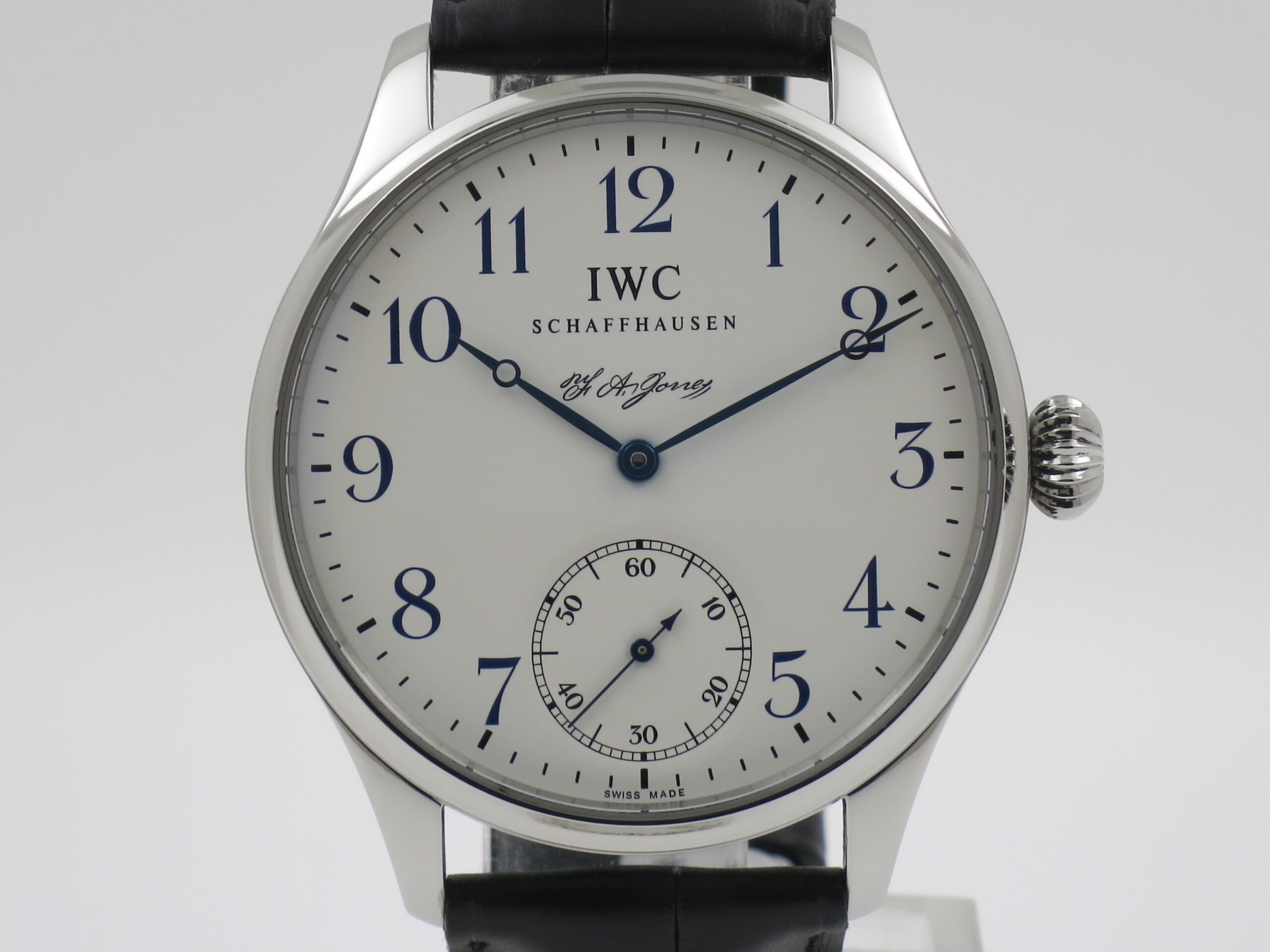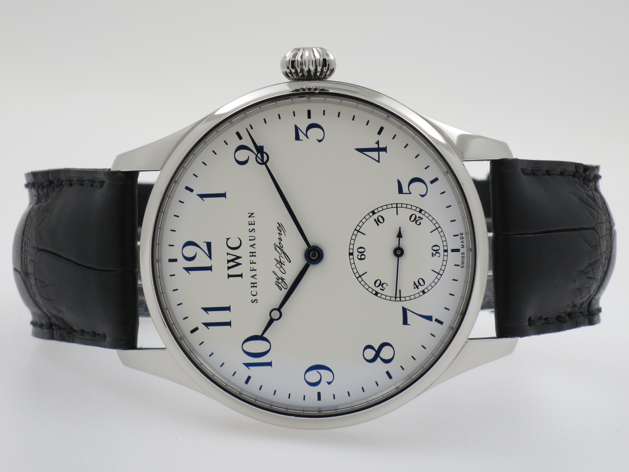 I.W.C. Schaffhausen "Portuguese F.A. Jones" Limited Edition, 3000 pieces ref. IW544203 Steel 43mm. case with sapphire glass. White colored dail with bleued hands. Manual winding movement, caliber manufacture IWC 98290 with time and small seconds. New black crocodil strap with IWC folding claps and used blue strap with IWC pinbuckle. Complete with IWC box and certificate year 2009. €. 5.995,00