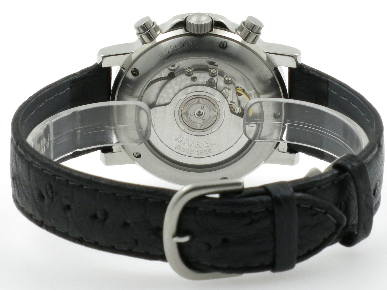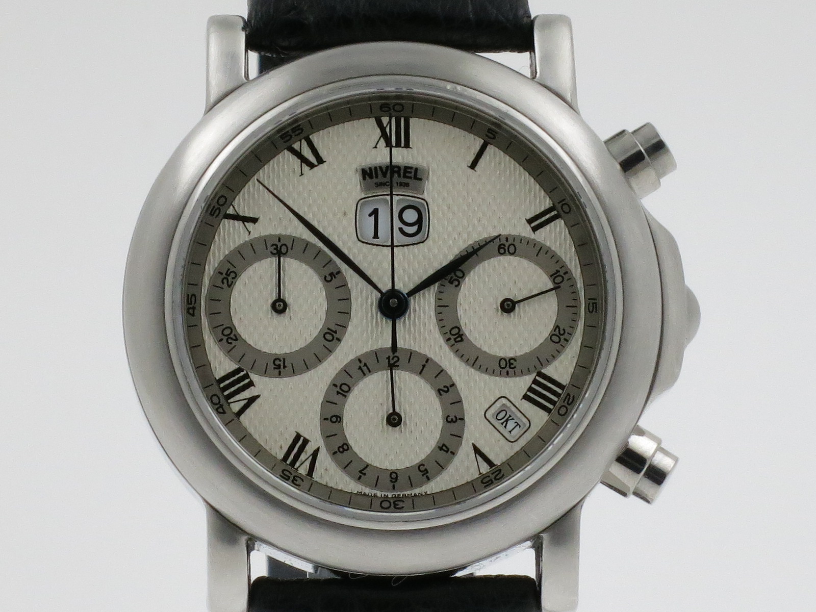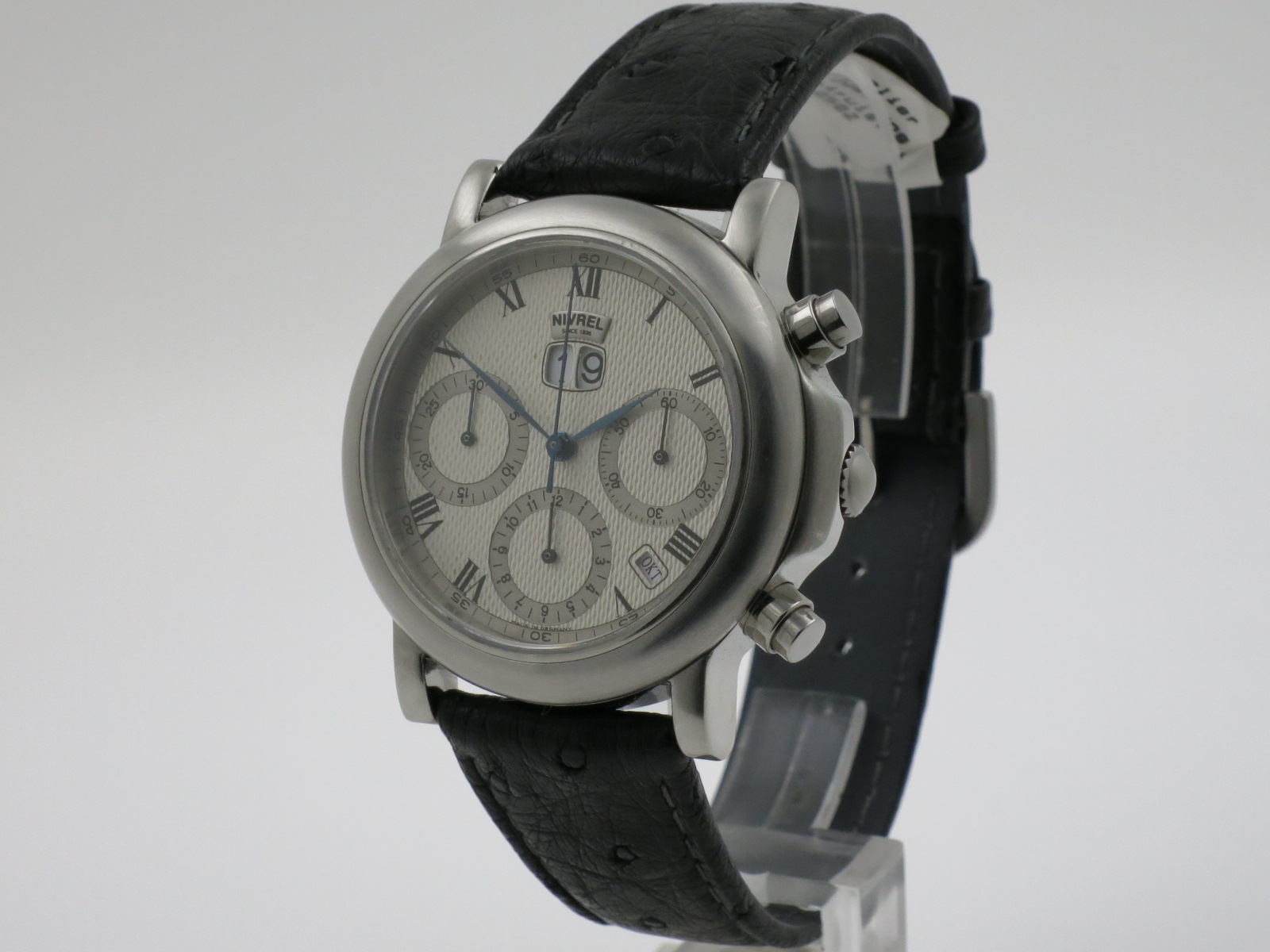 Nivrel "Héritage La Grande Date Chronograph" Ref. N580.001 Steel 38mm. case with sapphire glass. Silber colored dail. Automatic movement, caliber ETA 2892-A2 with time, bg date and month (4 year calendar). Orginal Nivrel black leather strap. Complete with original box, warranty card and Full Service invoice Nivrel €. 495,00.