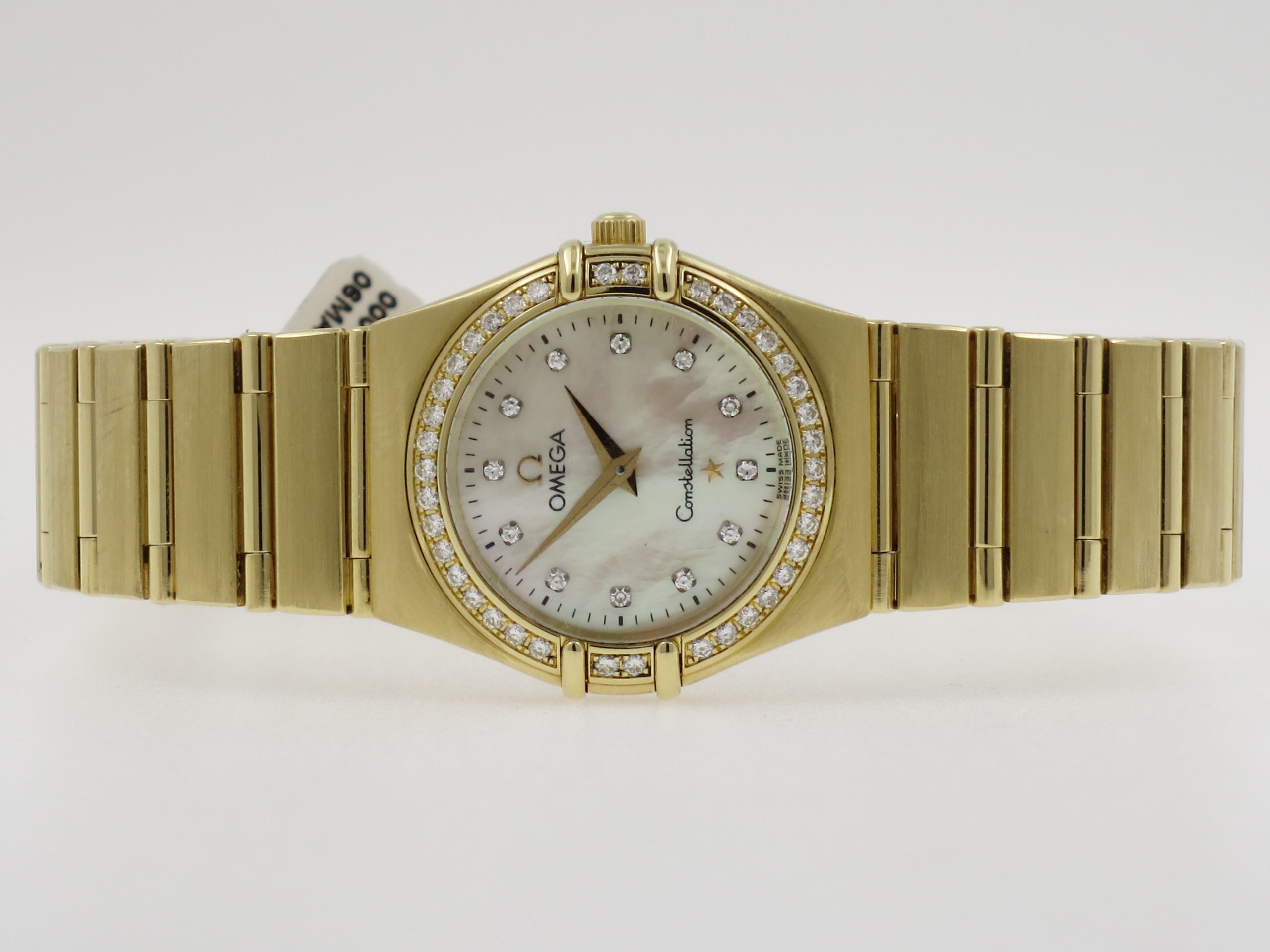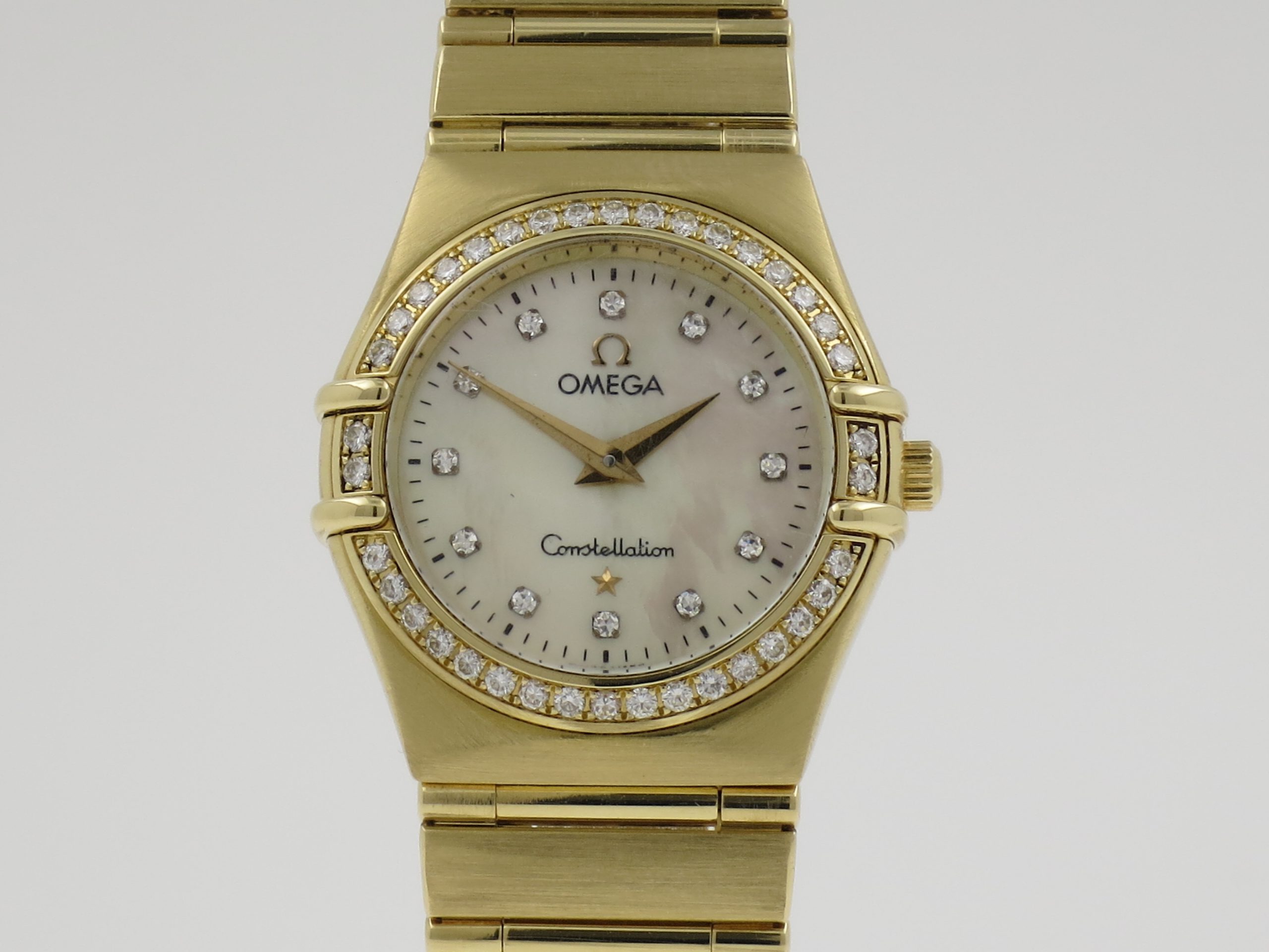 OMEGA "Constellation Diamonds Lady" ref. 895.1201 18K (750) gold case 25,5mm. with sapphire glass. Diamonds 0,42crt. TW/VVS (factory setting). White mother of pearl dial with diamonds. Quartz movement, caliber Omega 1456. 18K (750) gold bracelet ref. 6552/864. Incl. original box and manual, NO certificate. Full Service has been made Aug. 2023! €. 8.500,00