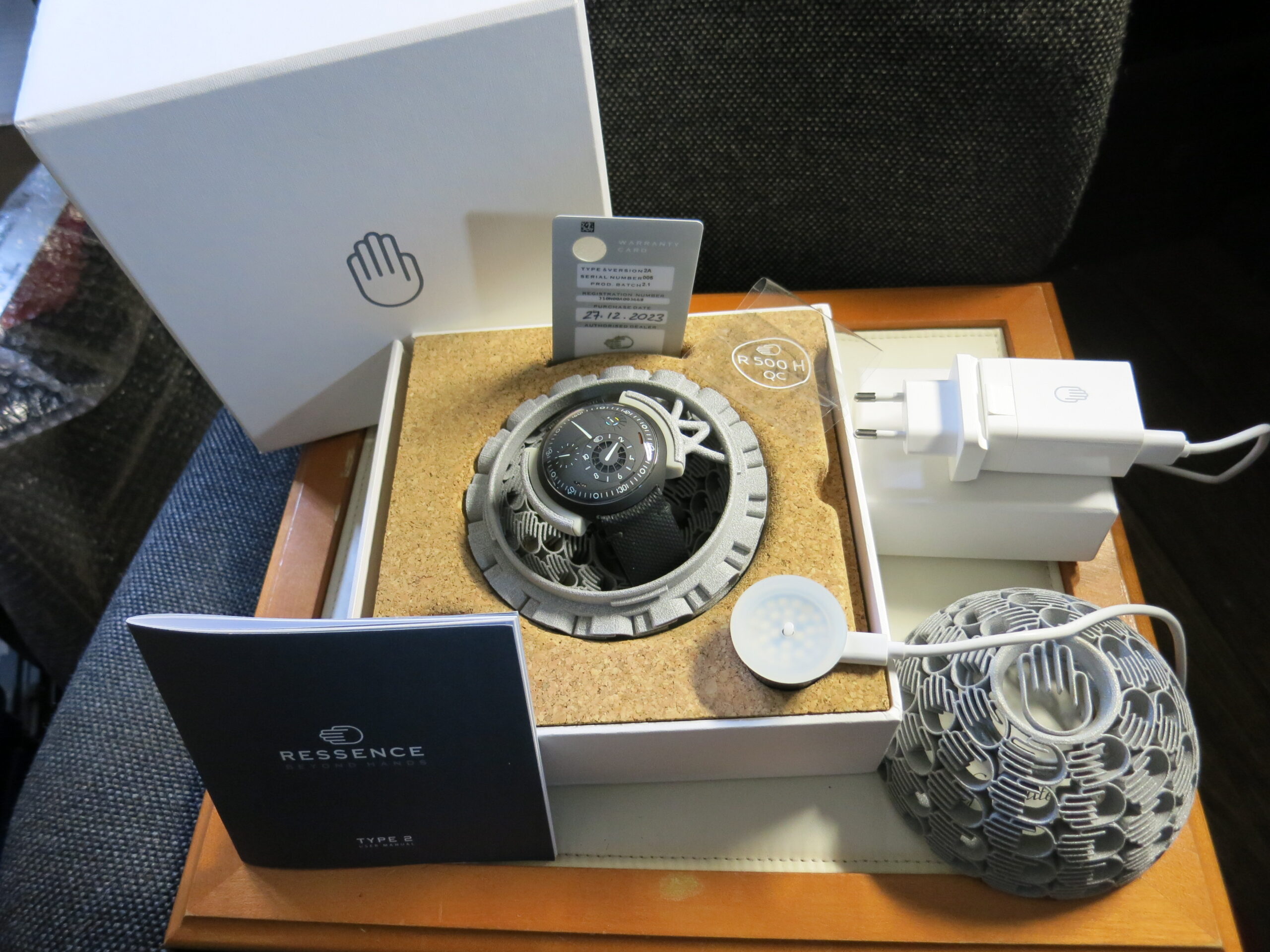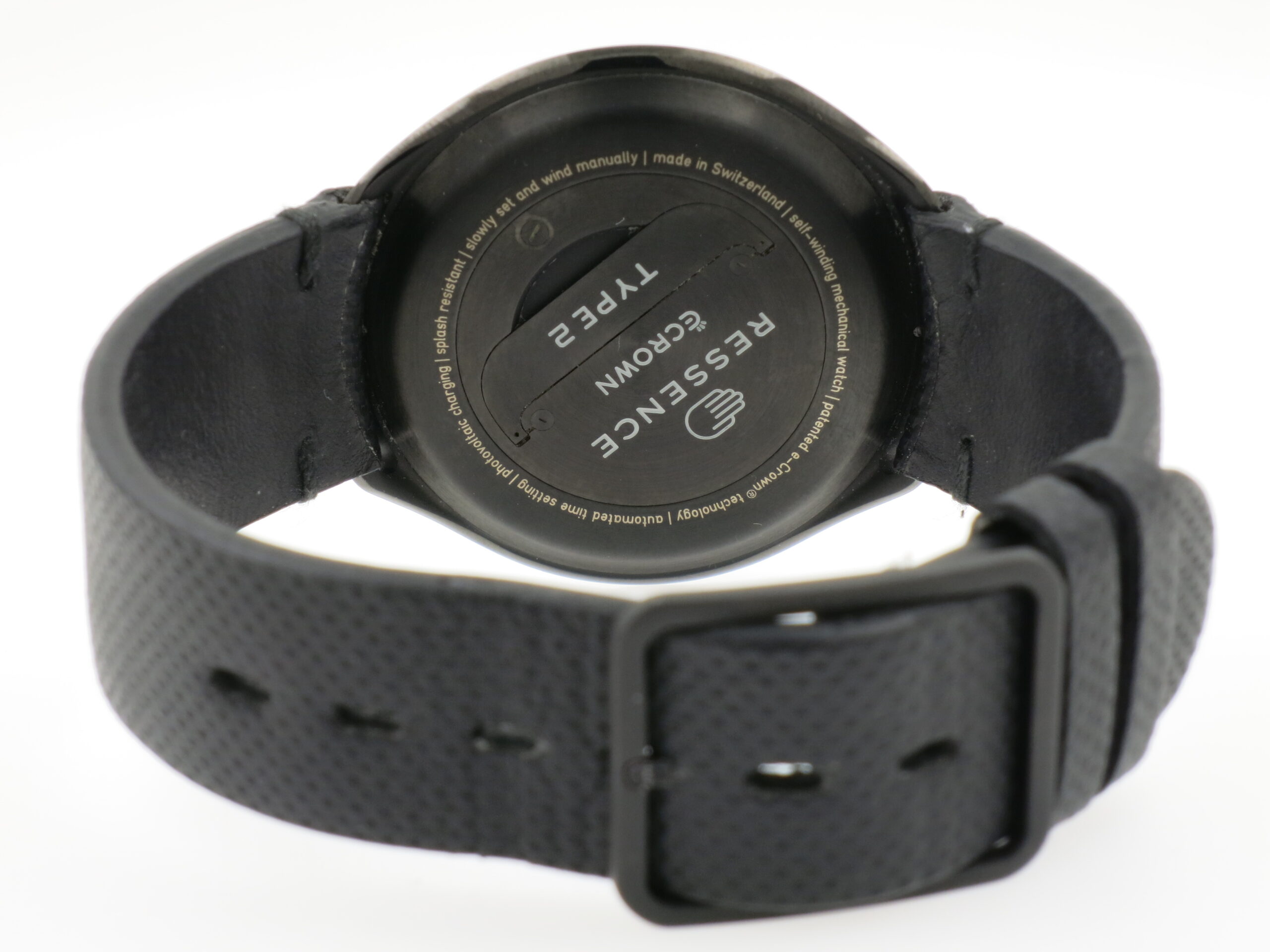 RESSENCE "Type 2 Automatic" ref. Type 2-1A Titanium black PVD 45mm. case with double domed sapphire glass. Black colored dial with luminova hands. Automatic movement, caliber ETA 2892-A with hours, minutes, small seconds and GMT. E-crown setting (solar charching). Org. black and yellow leather strap and org. pink crocodile stap with pin buckle. Complete with original box+travelbox, solar charger and all papers year Dec. 2023 (int. warranty till Dec 2025). Listprice new €. 52.800,00 Now €. 25.500,00