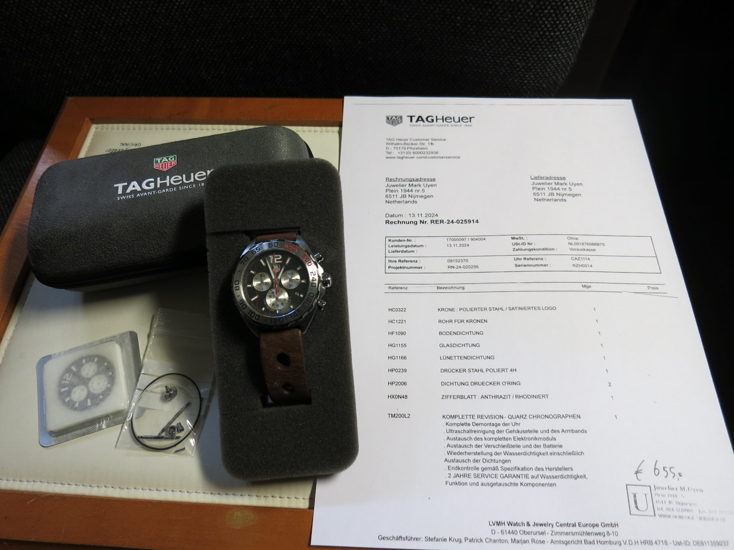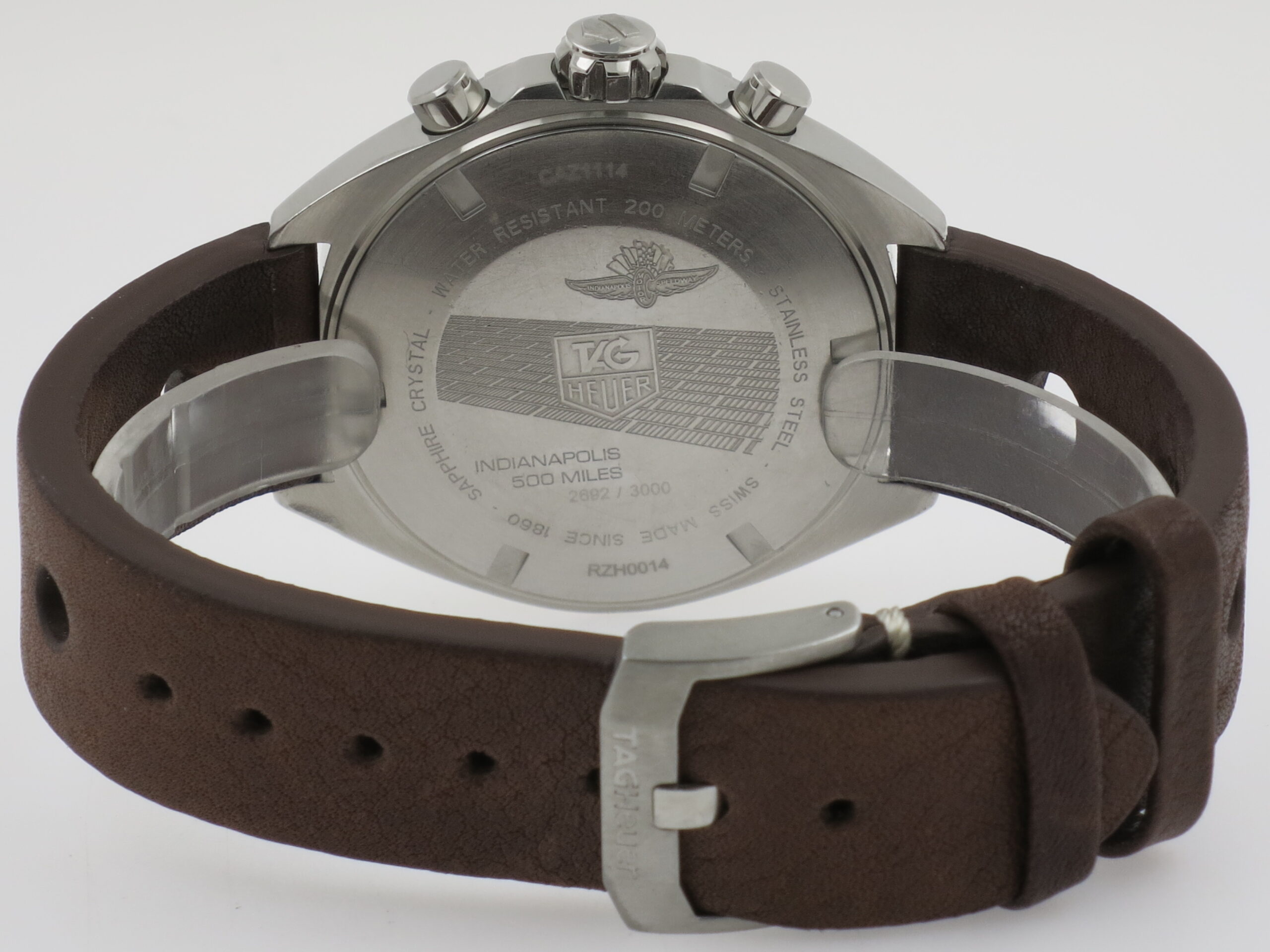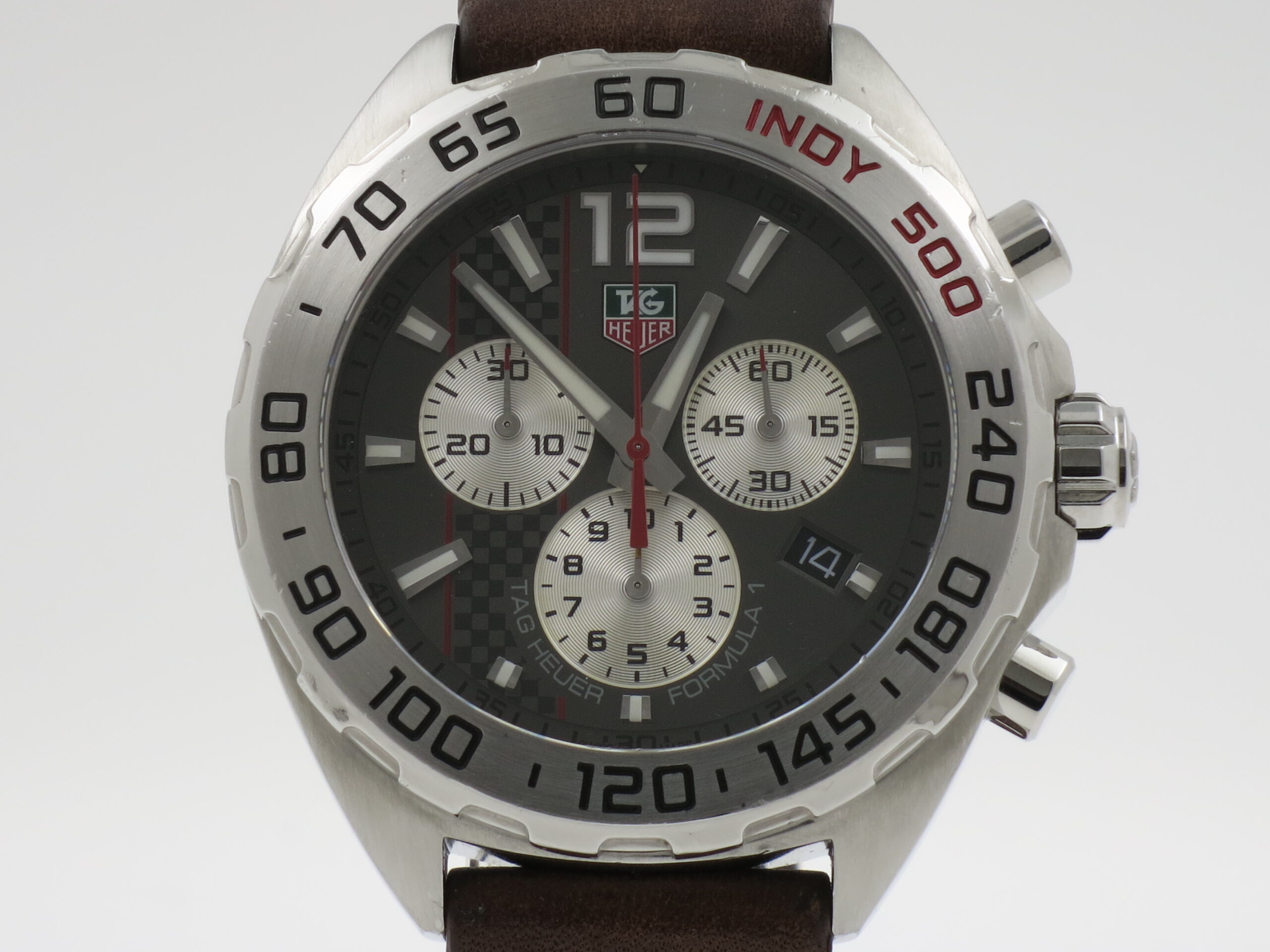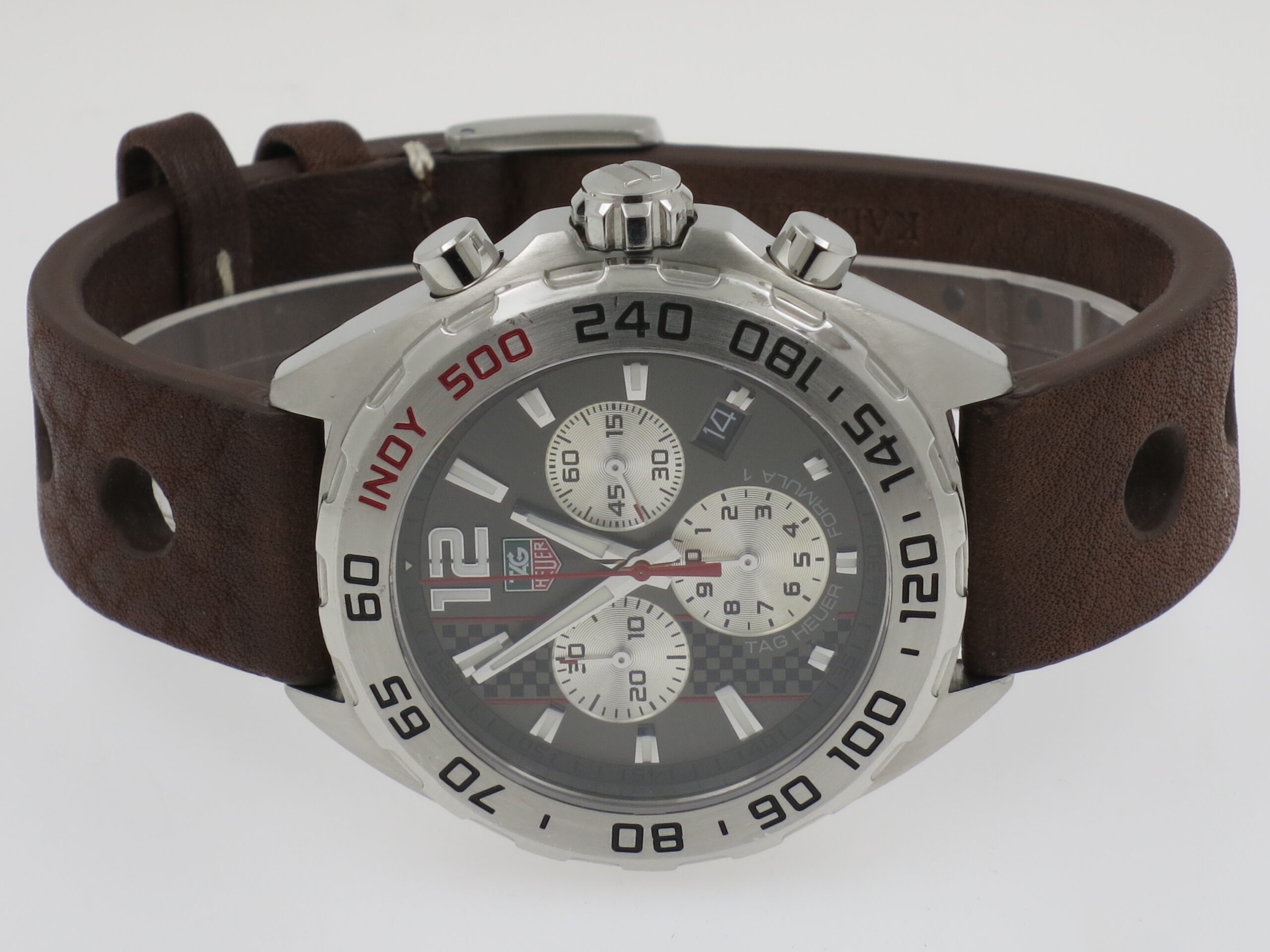 TAG Heuer "Formula 1 - Indy 500" ref. CAZ1114 Limited Edition 3000 pieces Steel 42mm. case with sapphire glass. Antracite colored dial. Quartz movement: time, date and 1/10 sec. chronograph. New brown leather Rally strap with TH pinbuckle. Incl. Tag Heuer service box and Full Service certificate (€. 655,00) 11-2024 €. 1.295,00