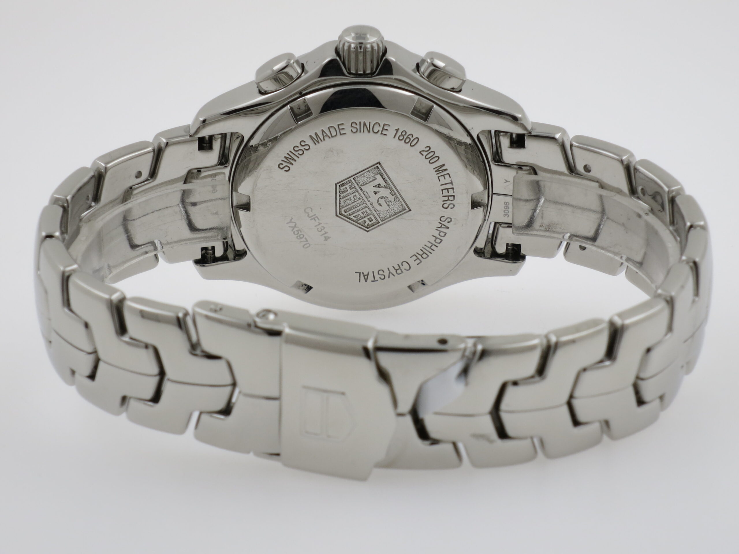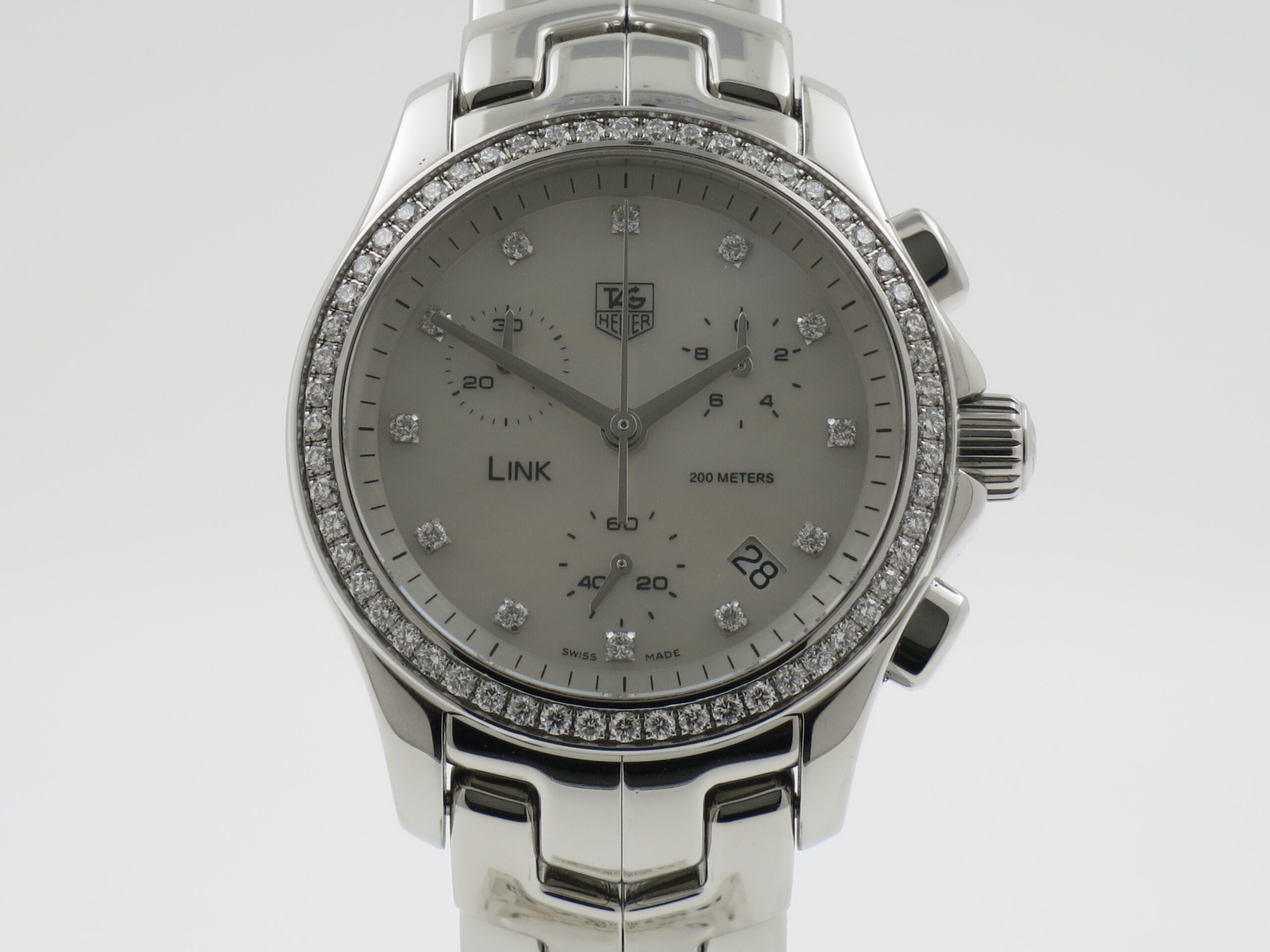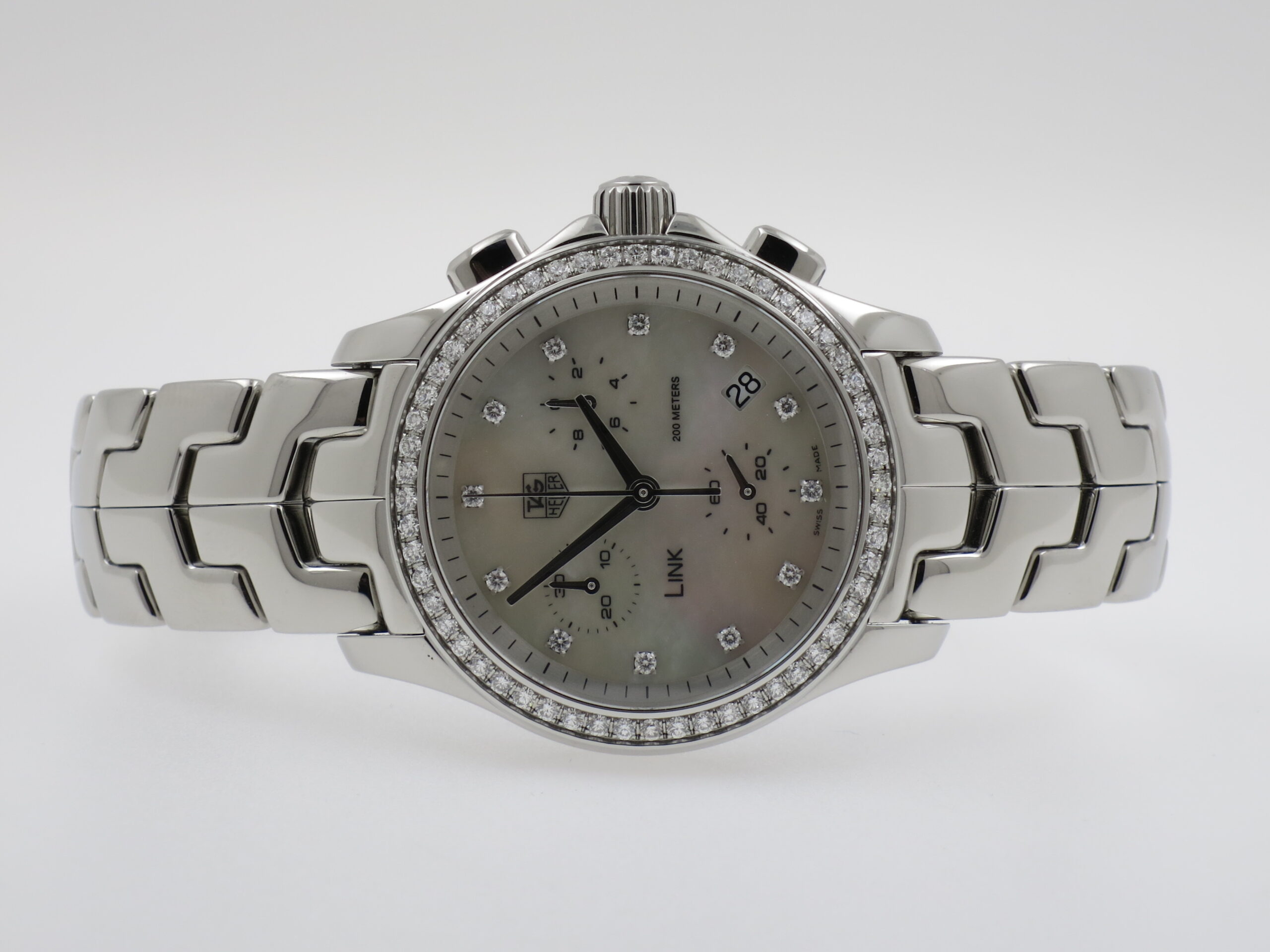TAG Heuer "Link Diamonds Chronograph" ref. CJF1314 Steel 33mm. case with sapphire glass. Factory setting diamonds, total 0,91crt. TW/VVS. White mother of pearl dial. Quartz movement: time, date and chronograph. Steel "Link" bracelet. Waterresistant 200 meter. Complete with original box and all certificates year 2006. €. 1.995,00