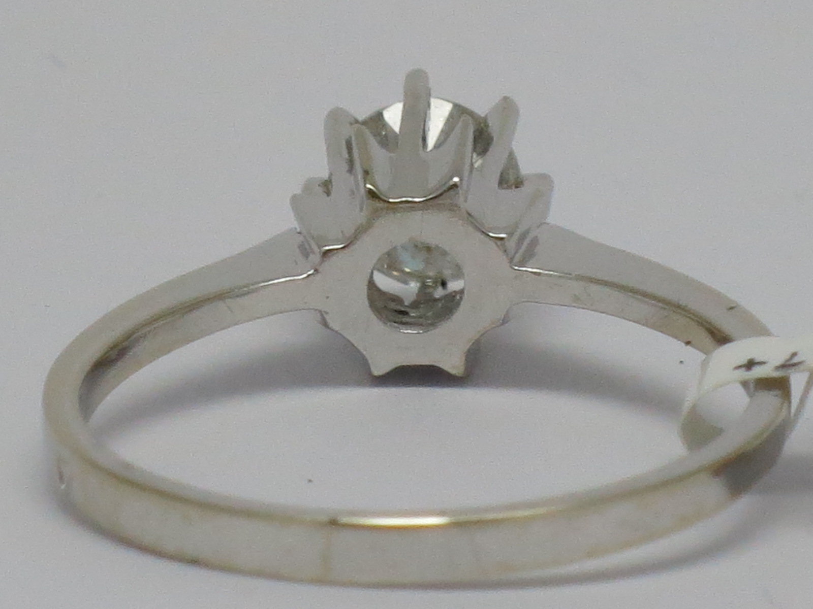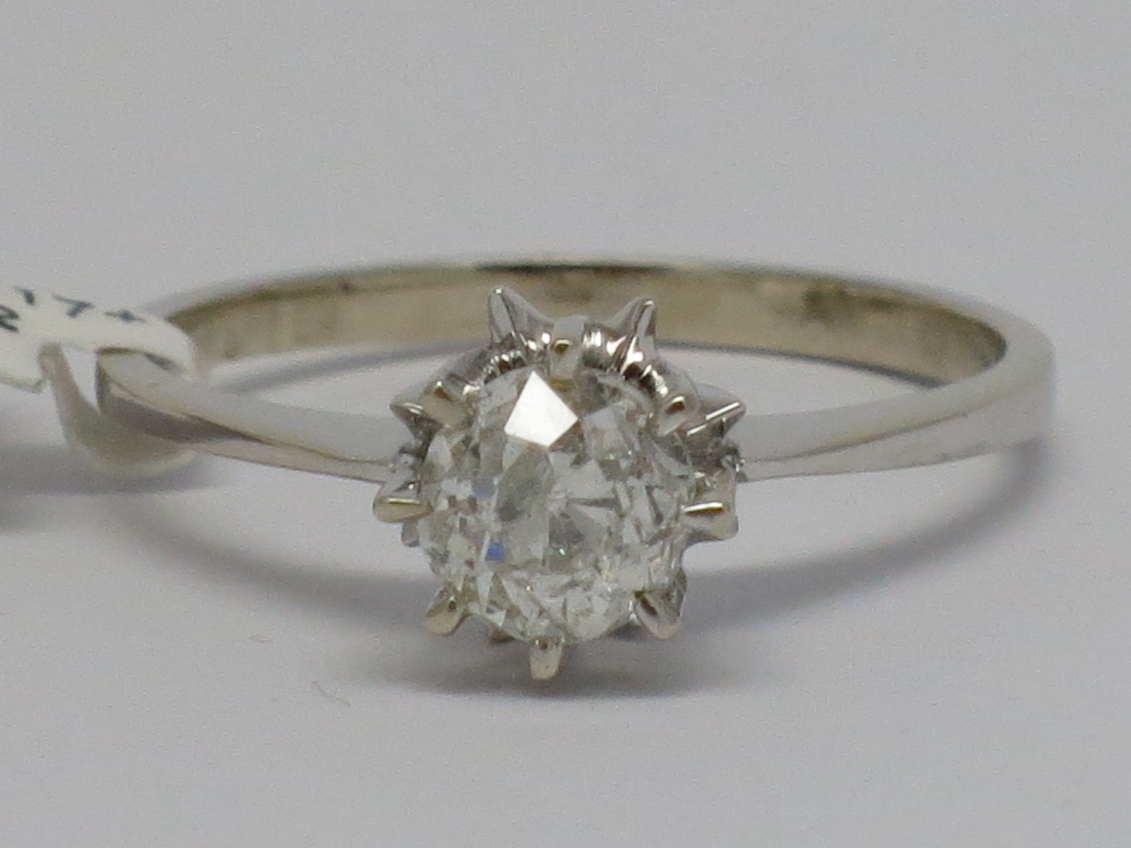 Occasion: 14 karaats witgouden solitair-ring met een natuurlijk diamant, bolsjewiek geslepen van +/- 0,75crt. €. 1.650,00