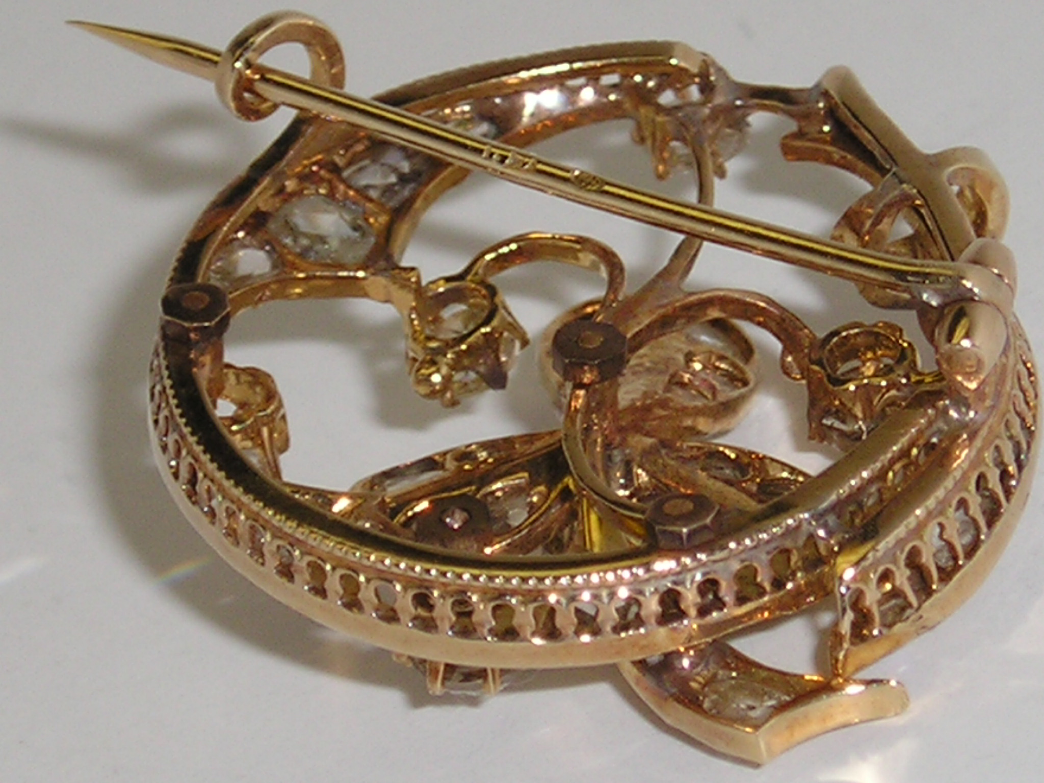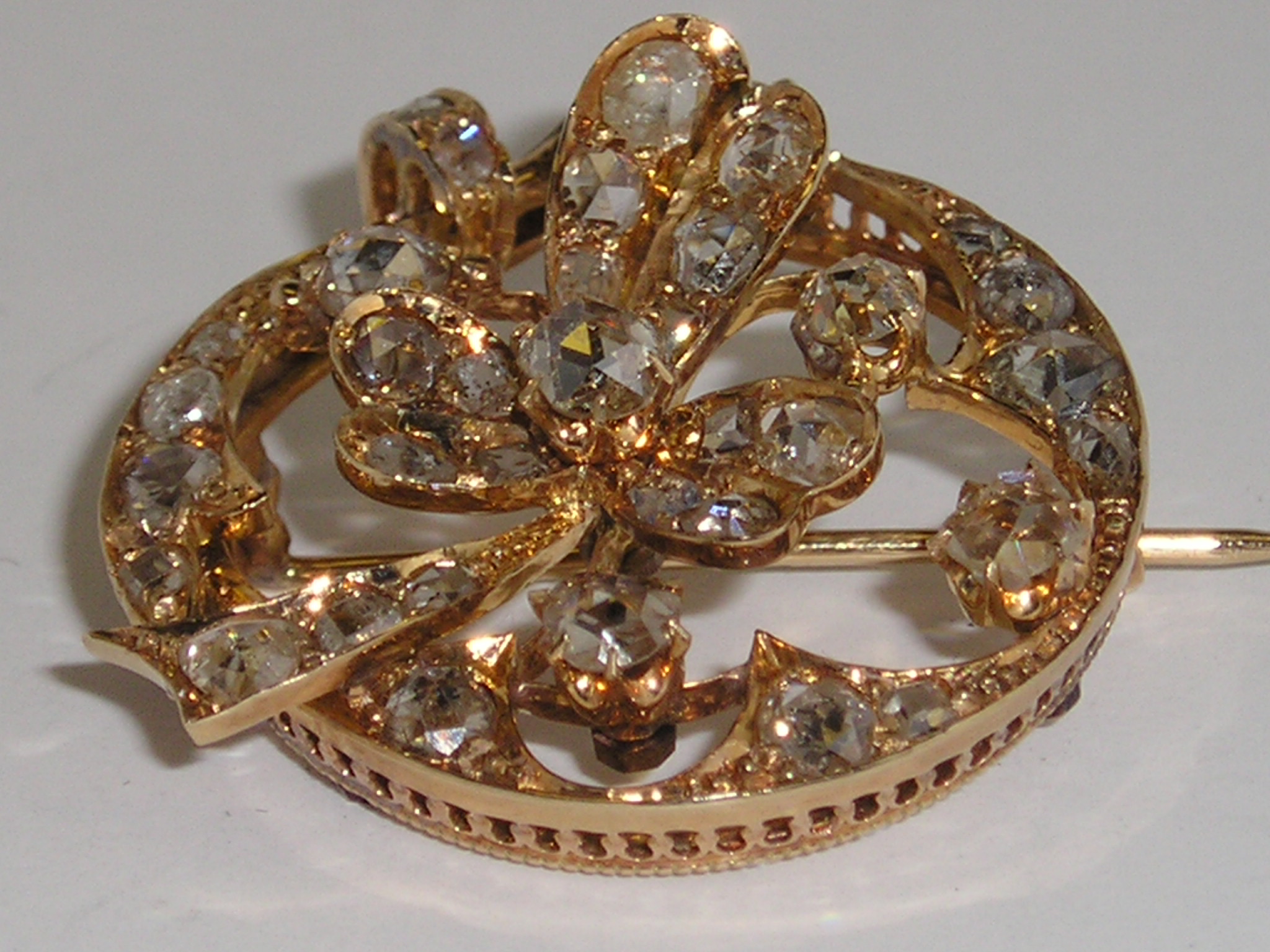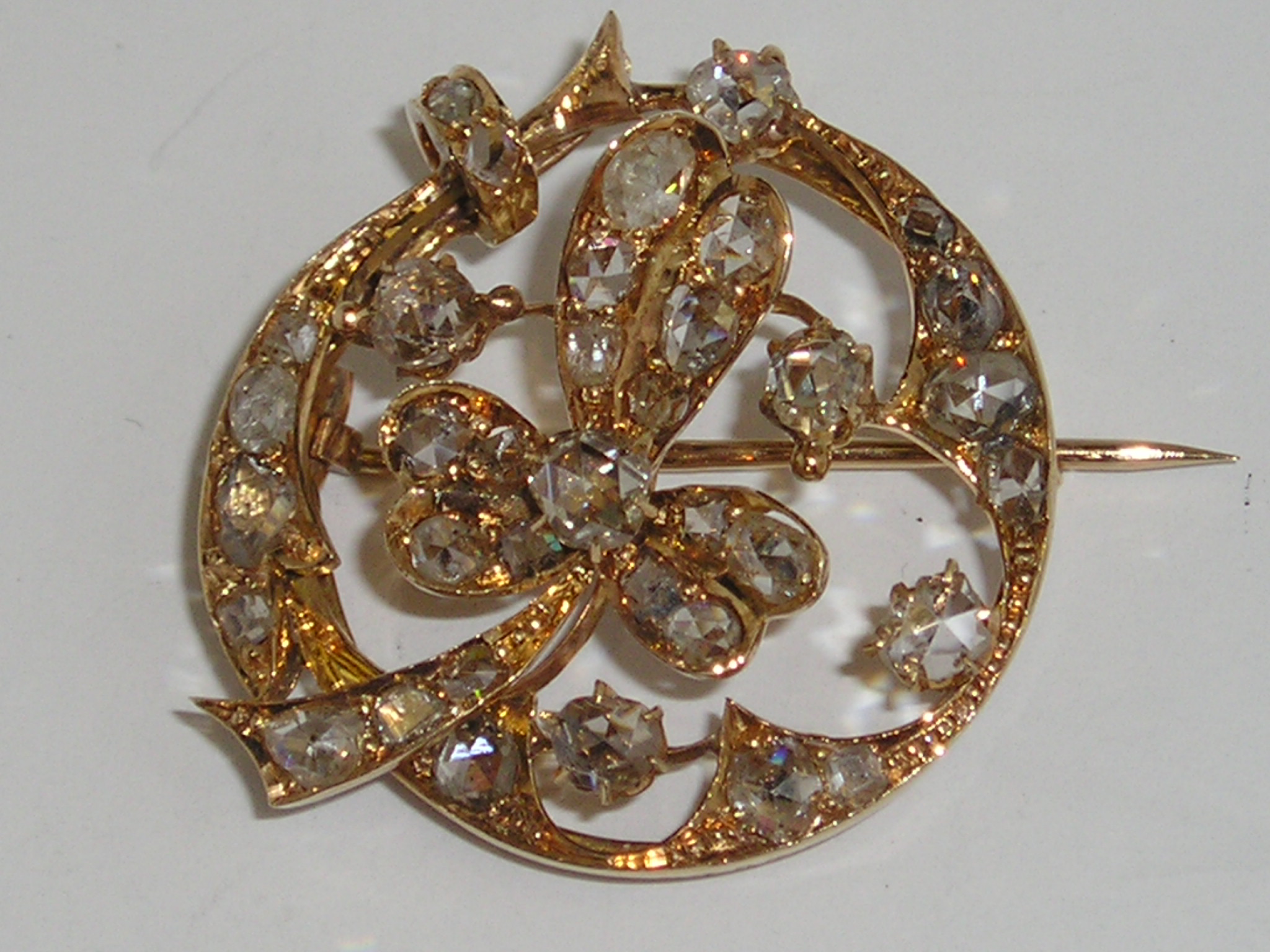 Occasion: Antieke 14 karaats gouden broche met natuurlijke roos geslepen diamanten. Doorsnede 30mm. €. 1.750,00