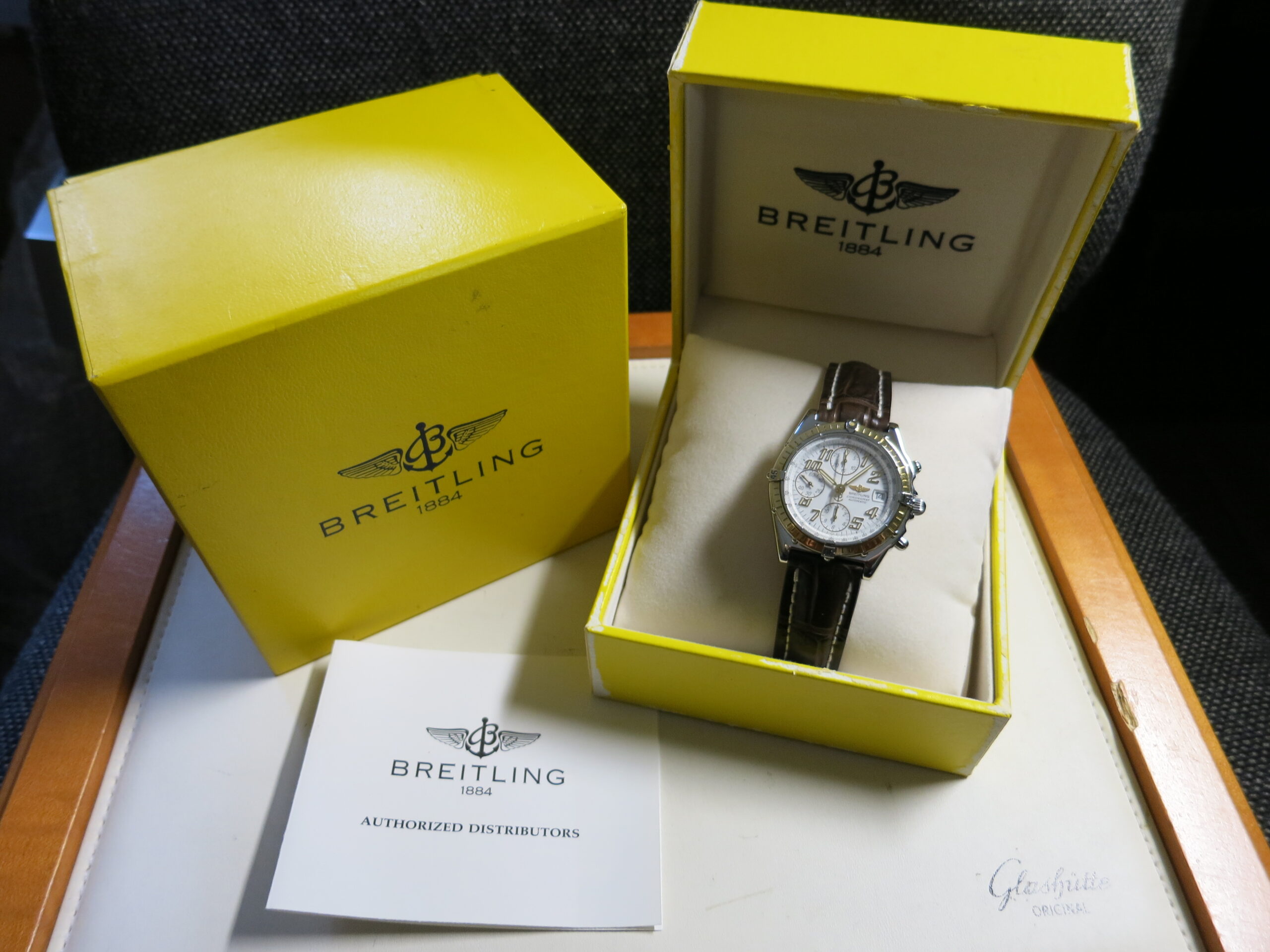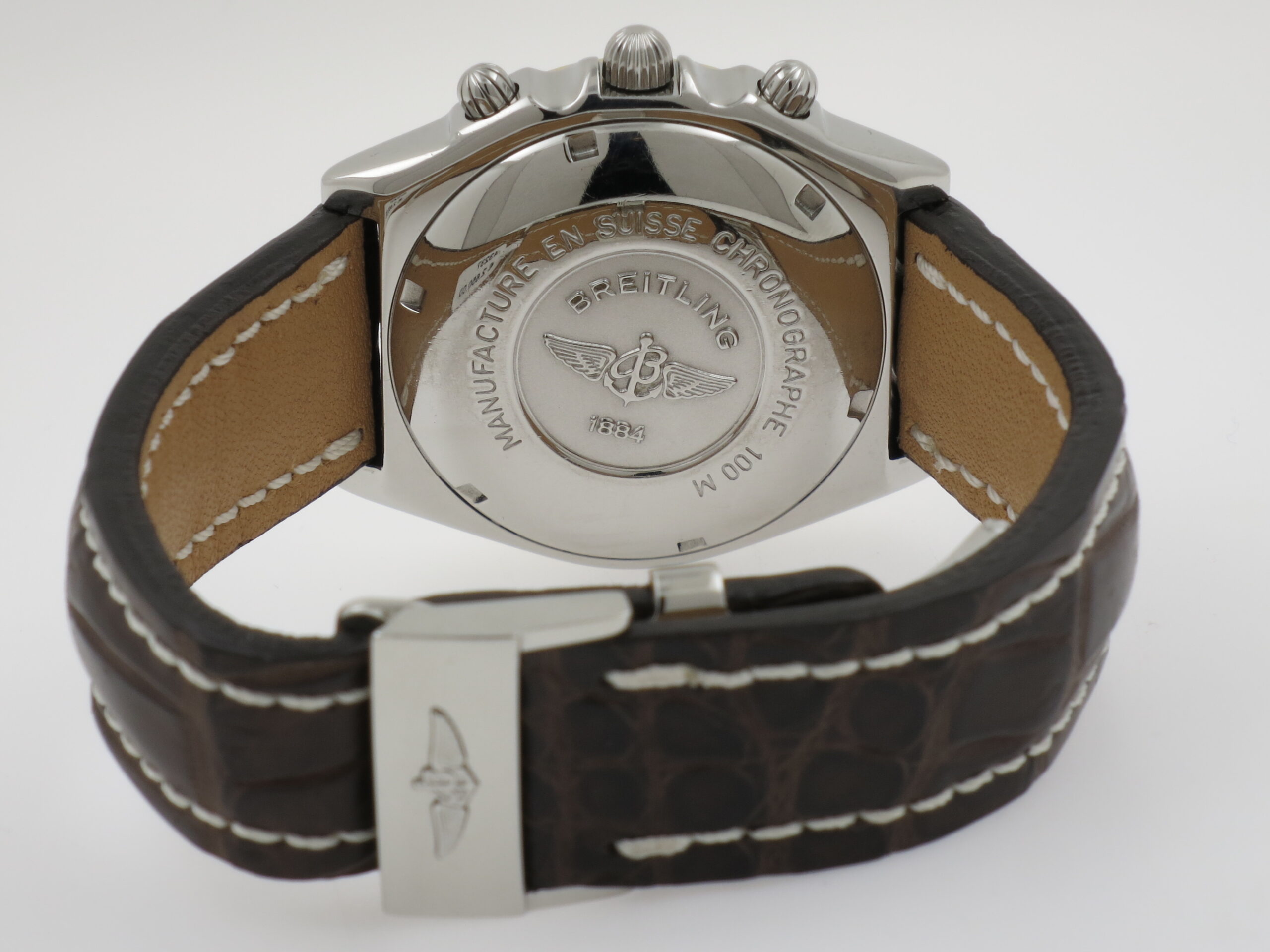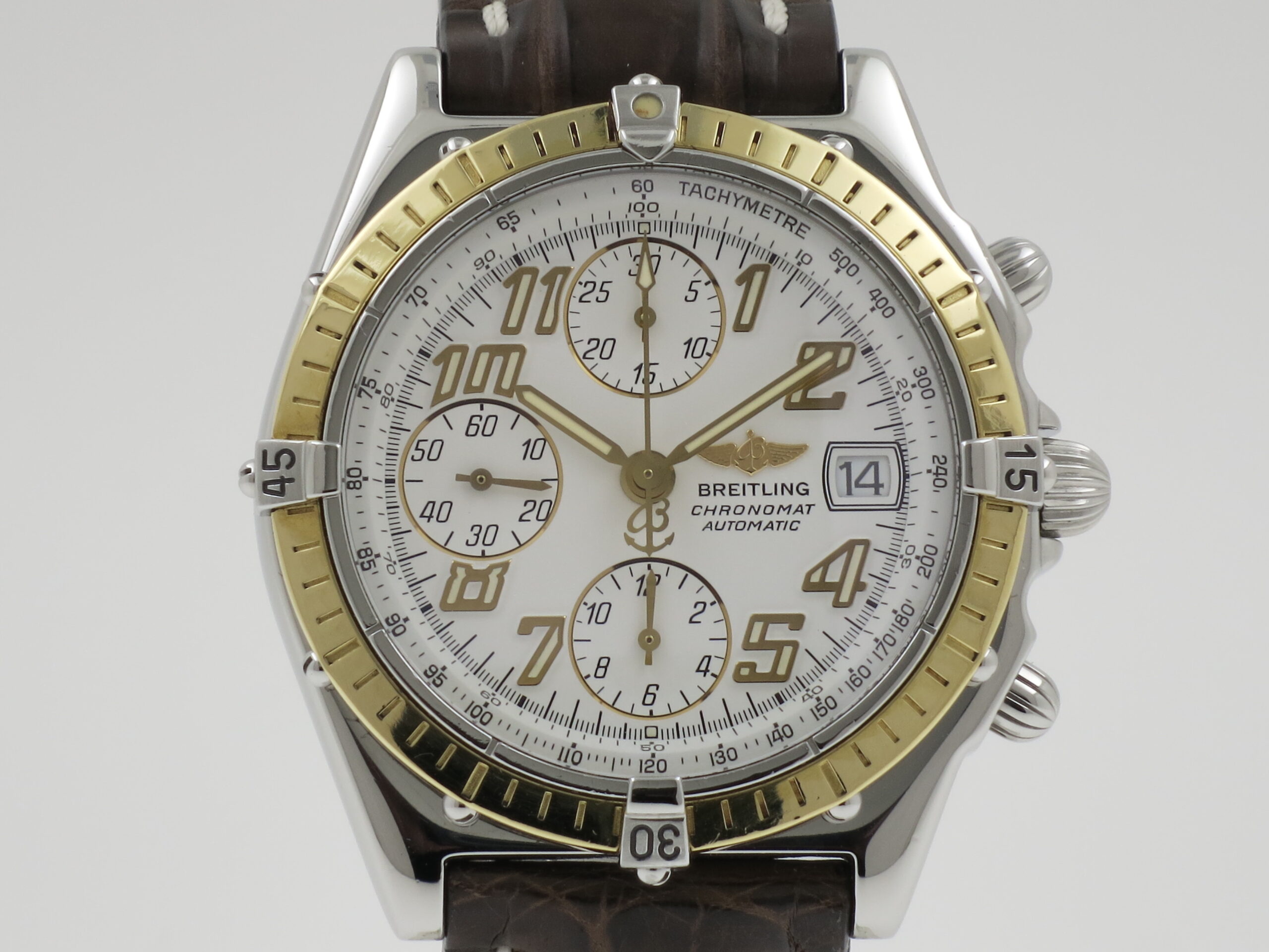BREITLING "Chronomat Vitesse" ref. D13050.1 Stalen 39mm. kast met massieve 18 karaats gouden bezel. Ontspiegeld saffierglas. Witte "Vitesse" wijzerplaat met cijfers. Automatisch uurwerk, caliber Breitling 13 met tijd, datum en chronograaf. Nieuw bruin krokodil lederen band met Breilting vouwsluiting. Incl. origineel verpakking, geen papieren. €. 2.650,00
