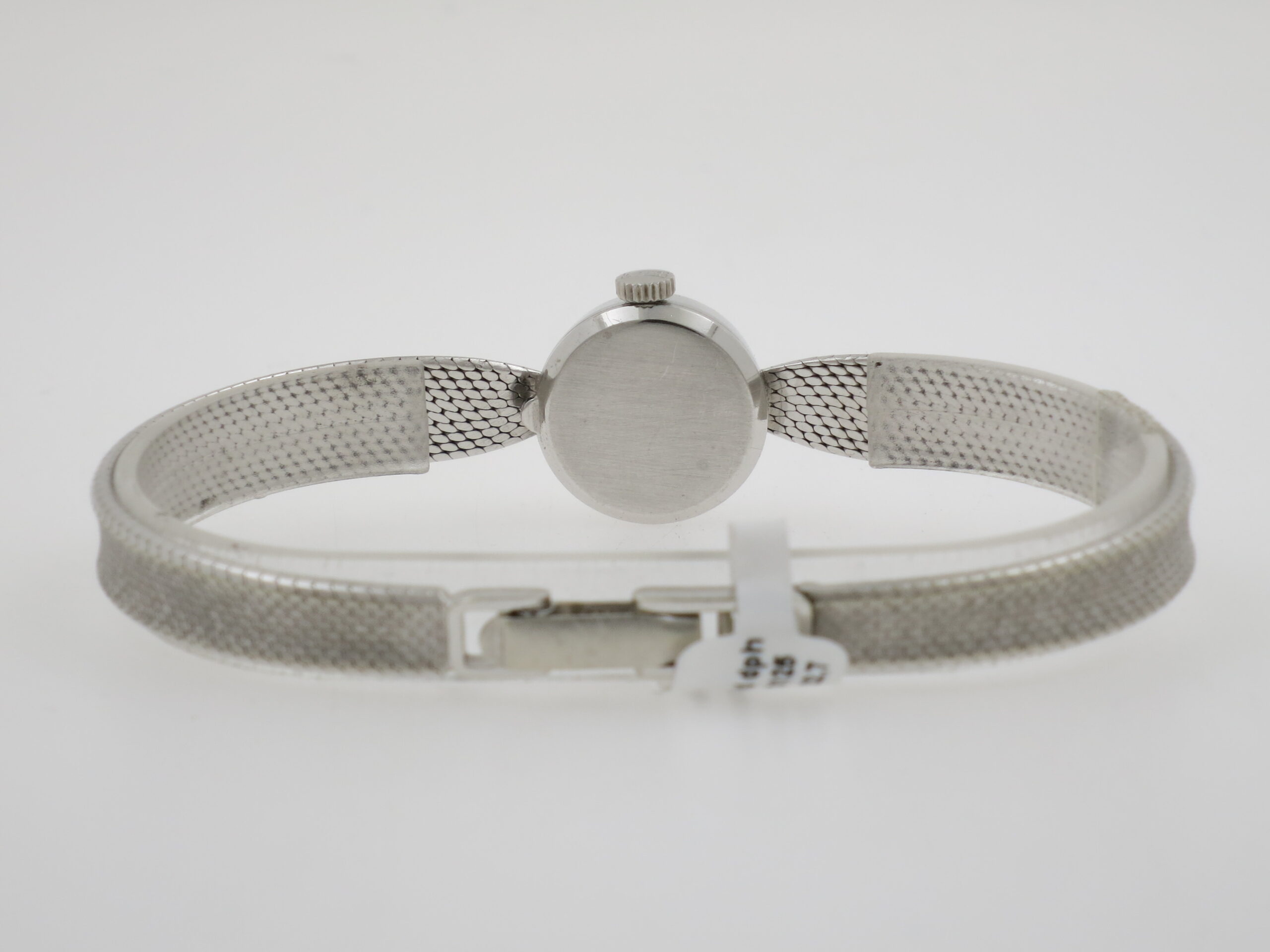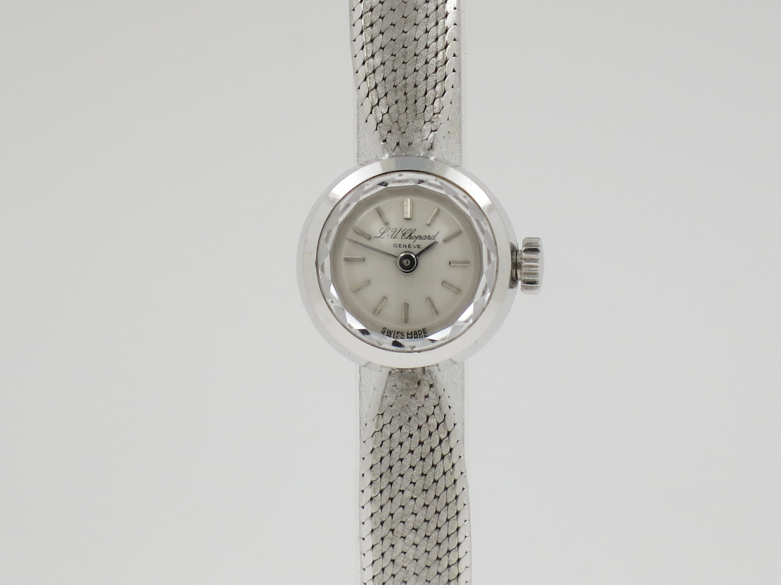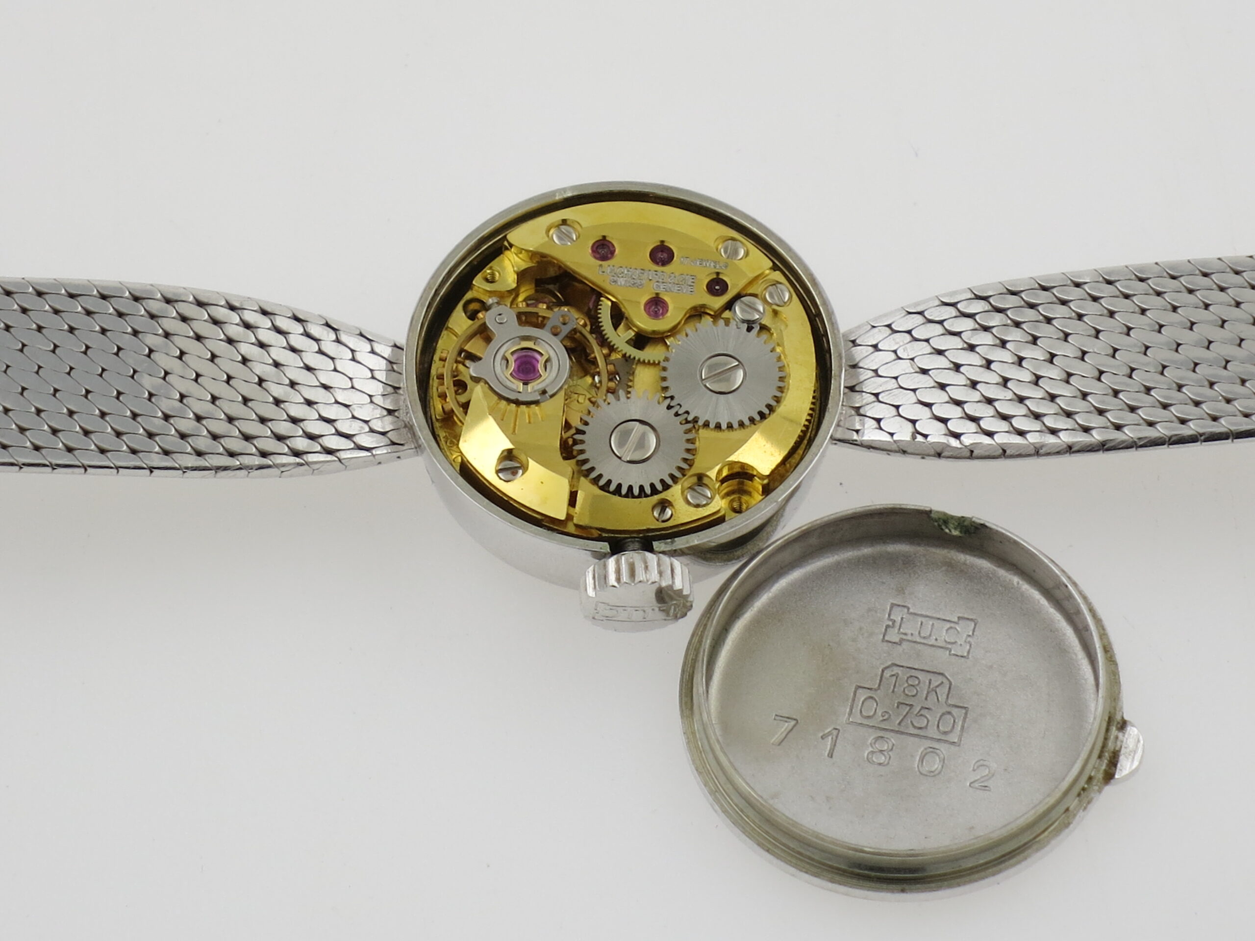 Chopard "L.U.C. Classique Ladies" ref. 71802 18 Karaats witgouden 15mm. kast met saffierglas. Zilver kleurige wijzerplaat met streepindexen. Hand opwind uurwerk, caliber 4520. 18 Karaats witgouden Milanese band (totaal lengte 17,5cm.). Jaar +/- 1970. €. 2.550,00
