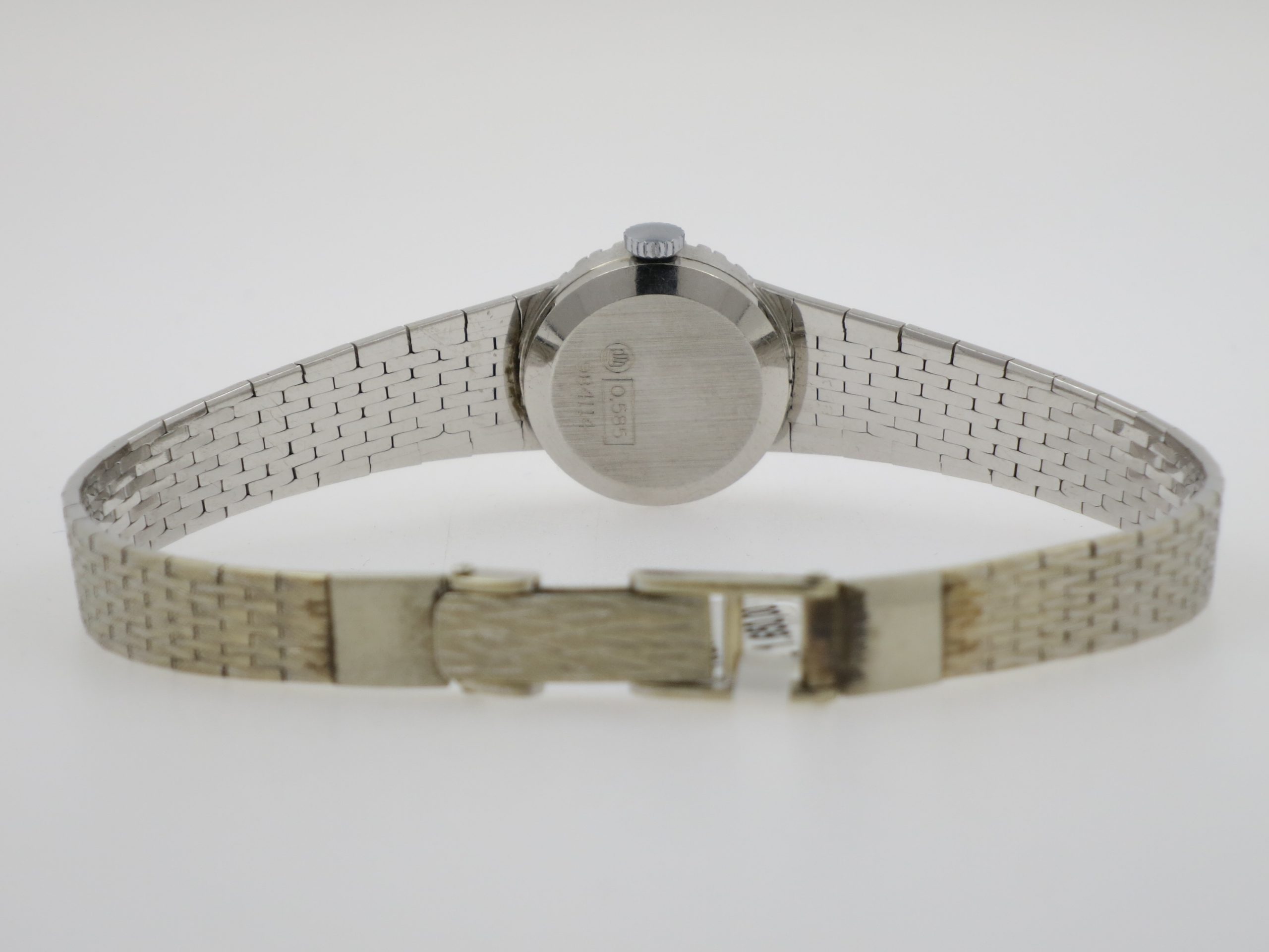 DUGENA Swiss "Dress Watch" 14 karaats witgouden dameshorloge. 17mm. kast met plexi-glas. Diamanten bezel. Zilver kleurige wijzerplaat met streep-indexen. Hand opwind uurwerk. Wit gouden band. Jaar +/- 1960-1970. €. 2.650,00