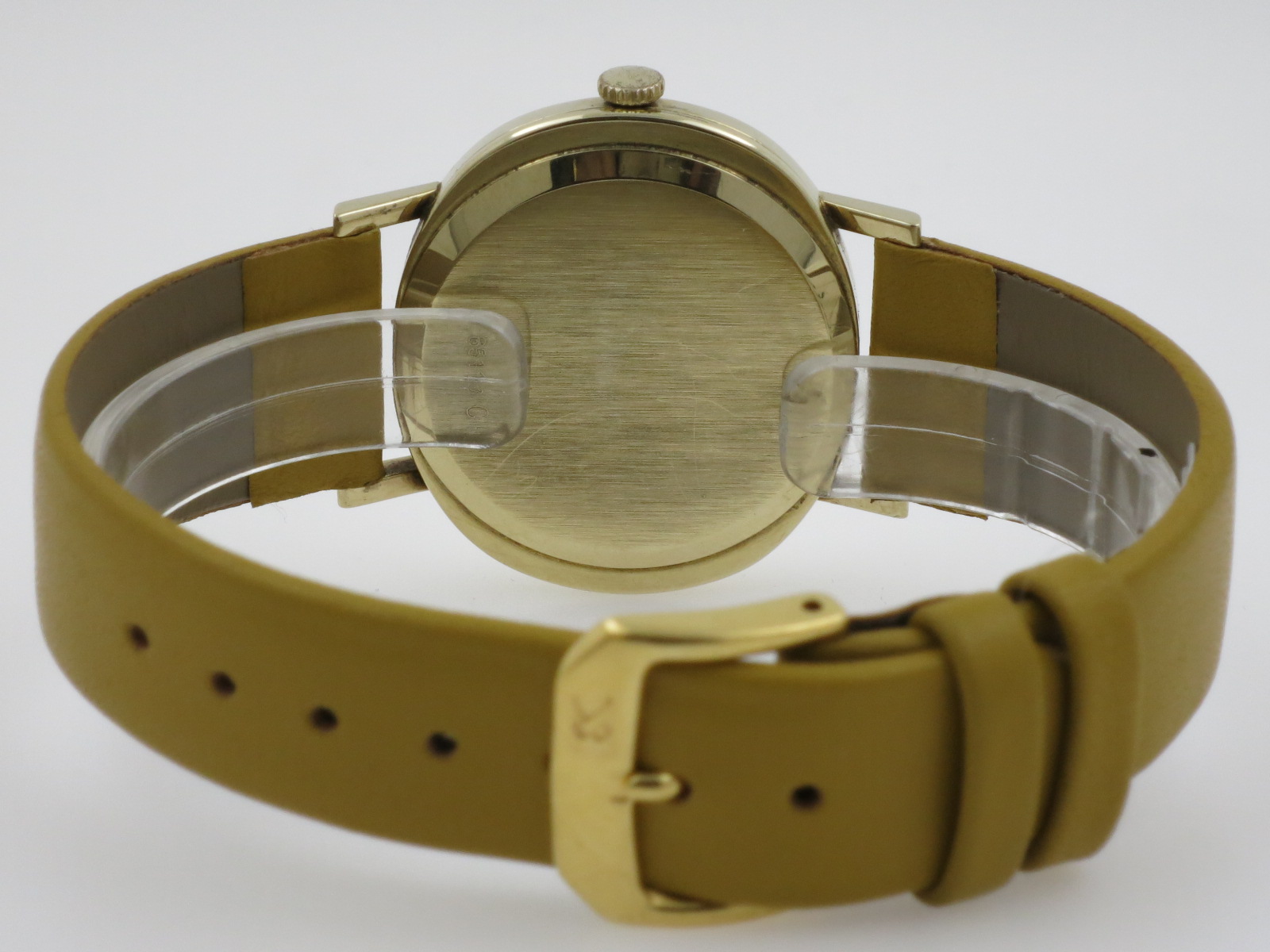 PONTIAC "Memomatic" 14 Karaats gouden ovale kast 35x31mm. met plexi-glas. Champagne kleurige wijzerplaat. Automatisch uurwerk, caliber ETA 2782 met tijd en datum. Mais kleurige lederen band. Jaar +/- 1970. €. 495,00