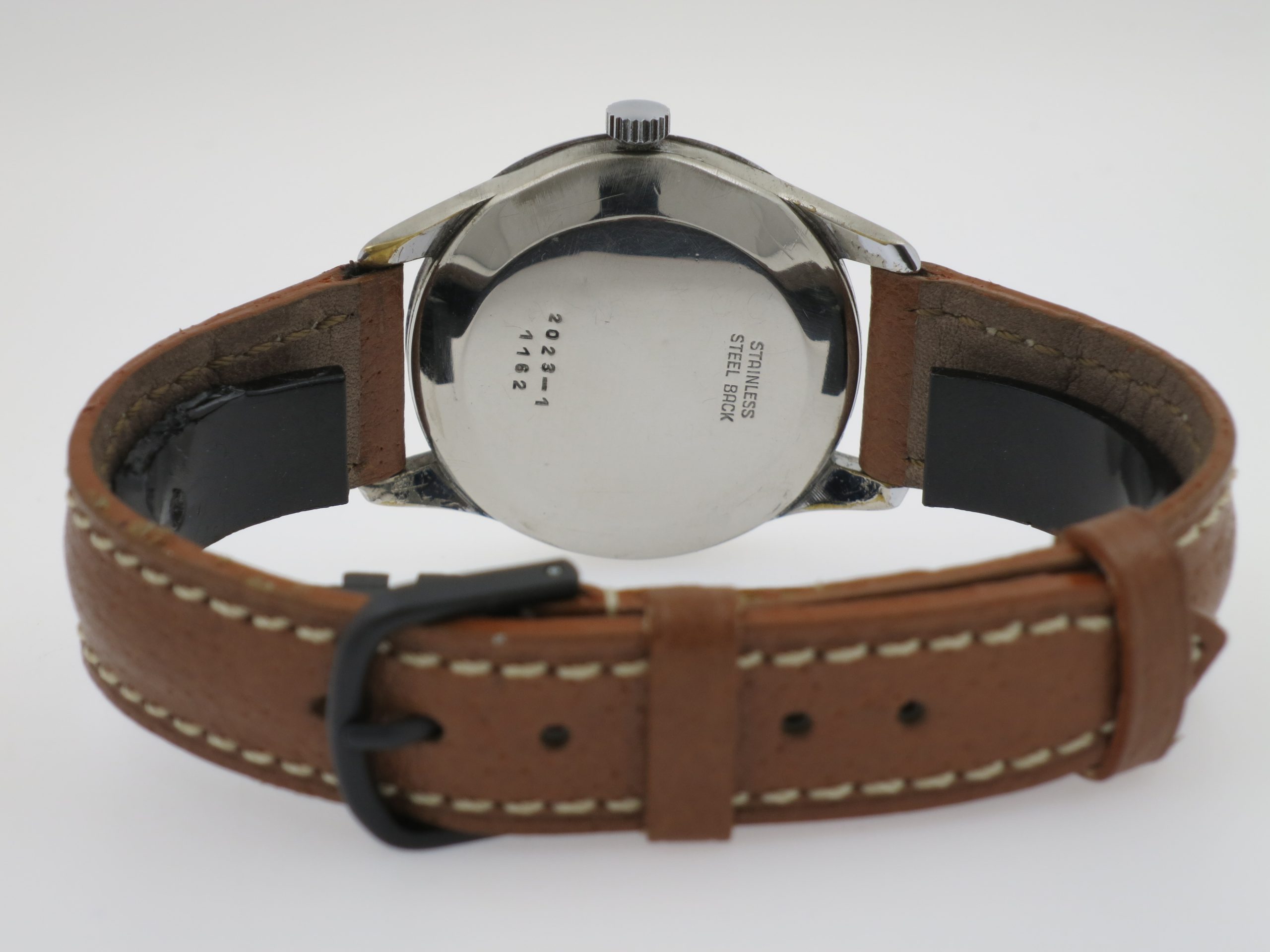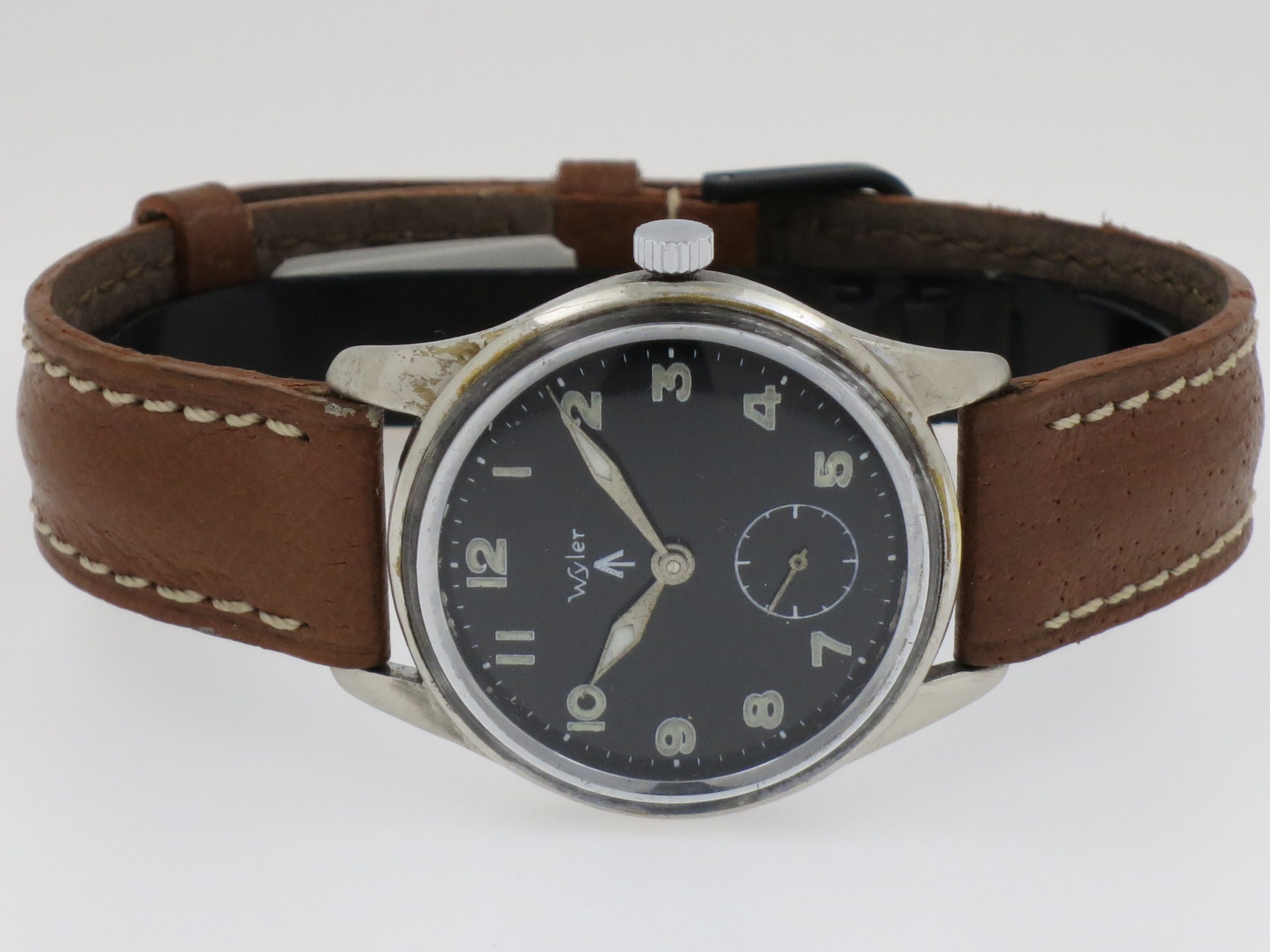 Wyler "Millitary Watch" ref. 2023-1 Stalen 32mm. kast met plexi glas. Zwarte wijzerplaat met cijfers. Handopwind uurwerk, caliber AS 1028. Bruin lederen band. Jaar 1940-1950. €. 295,00
